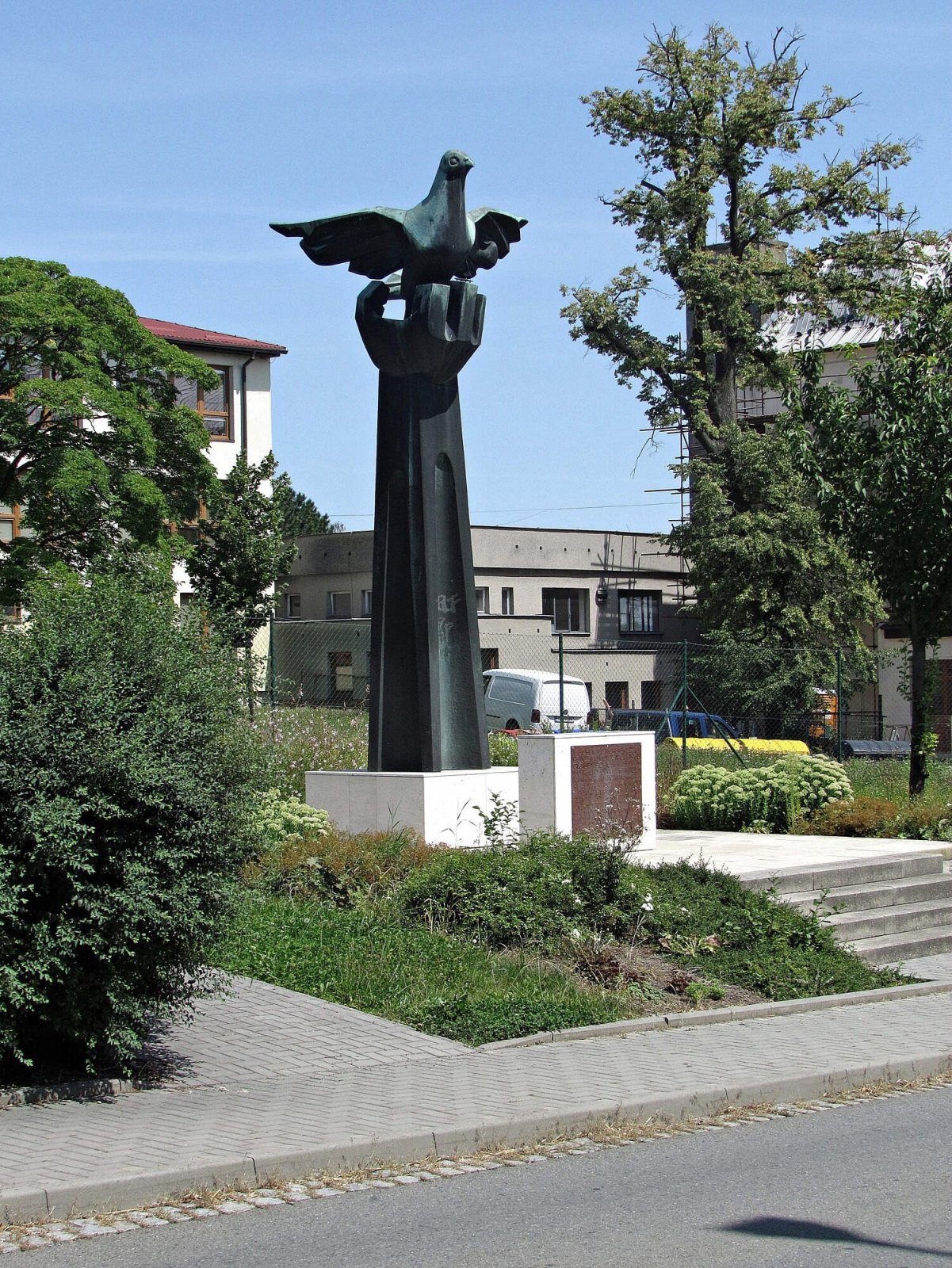 Památník sestává z masivního hranolového soklu s bronzovou pamětní deskou a z podstavce vysoko vystupuje ruka s rozevřenou dlaní, v níž sedí holubice s roztaženými křídly.