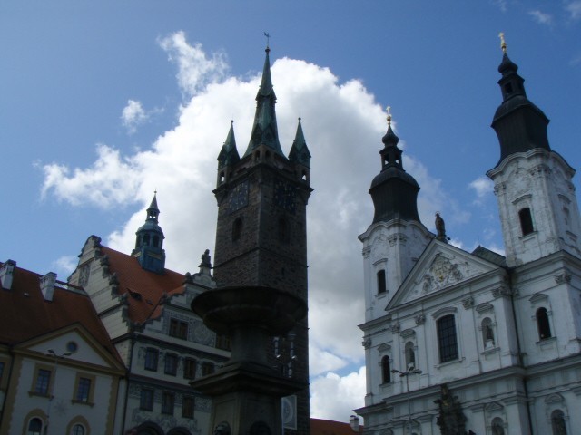 Pětipatrová věž je vysoká 81,6 m a byla postavena v r. 1547-55 mistrem Anoňem za účelem signalizace nebezpečí....požáry a nepřítelská vojska. V r. 1805 byla věž osazena hodinami od klatovského mechanika Jana Boška. Velká ručička měří 2 metry a malá ručička s číslicemi jsou pozlaceny. K Ochozu vede 226 schodů. Skokem z věže skončilo svůj život již 6 sebevrahů.První byl v r. 1884 Antonín Dobízl - student.