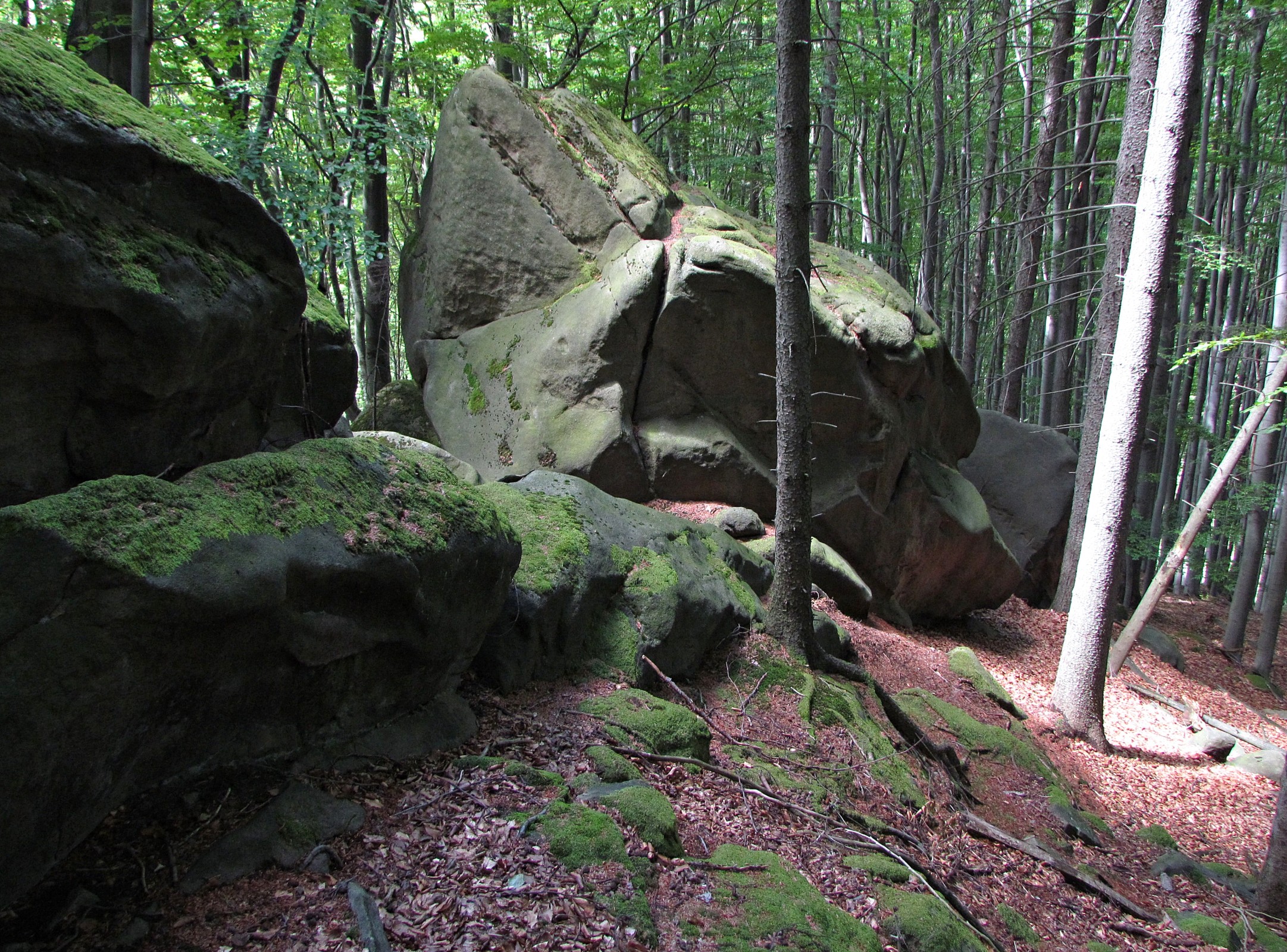 Pod Komínem skalnatý svah nad pasekou velice strmě klesá k nedaleké lesní cestě v údolí, kterým bychom se dostali pod přehradní hráz Bystřičky. Jinak nás čeká návrat do strmého svahu a úmorný výstup zpět pod vrchol Klenova v délce více jak 400 m!