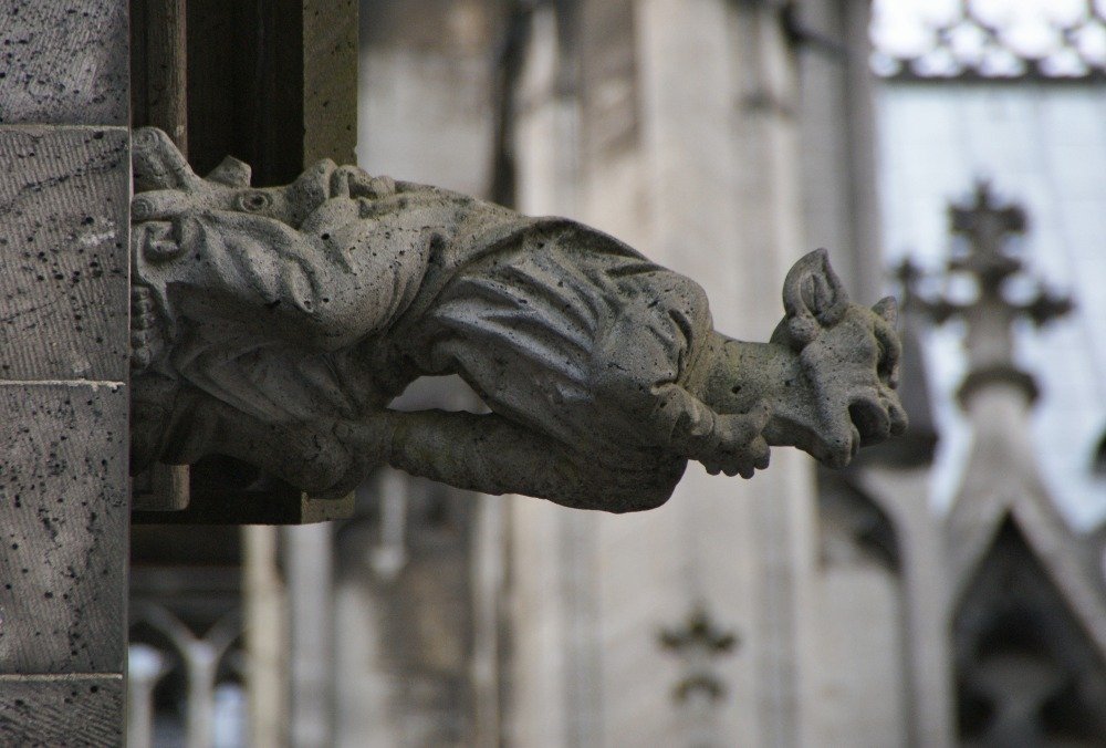 Nedílnou, a jistě velice významnou, součástí každé správné gotické katedrály jsou také kamenné chrliče, které zdobí tyto nádherné monumentální stavby. A jak už to u těchto pozoruhodných uměleckých výtvorů bývá zvykem, mají kromě účelu dekorativního a ryze technicko – praktického také funkci ochrannou. Tyto – v drtivé většině – tajemné démonické figurky mají totiž „svou“ stavbu zrcadlově chránit před démony skutečnými, zlo přinášejícími. Mnohdy až člověka napadne, jestli nakonec ten odvod dešťové vody a ochrana stěn i oken chrámu před její destruktivní silou nebyl od samého počátku až úkolem druhotným. A nejinak je tomu i u katedrály kolínské …