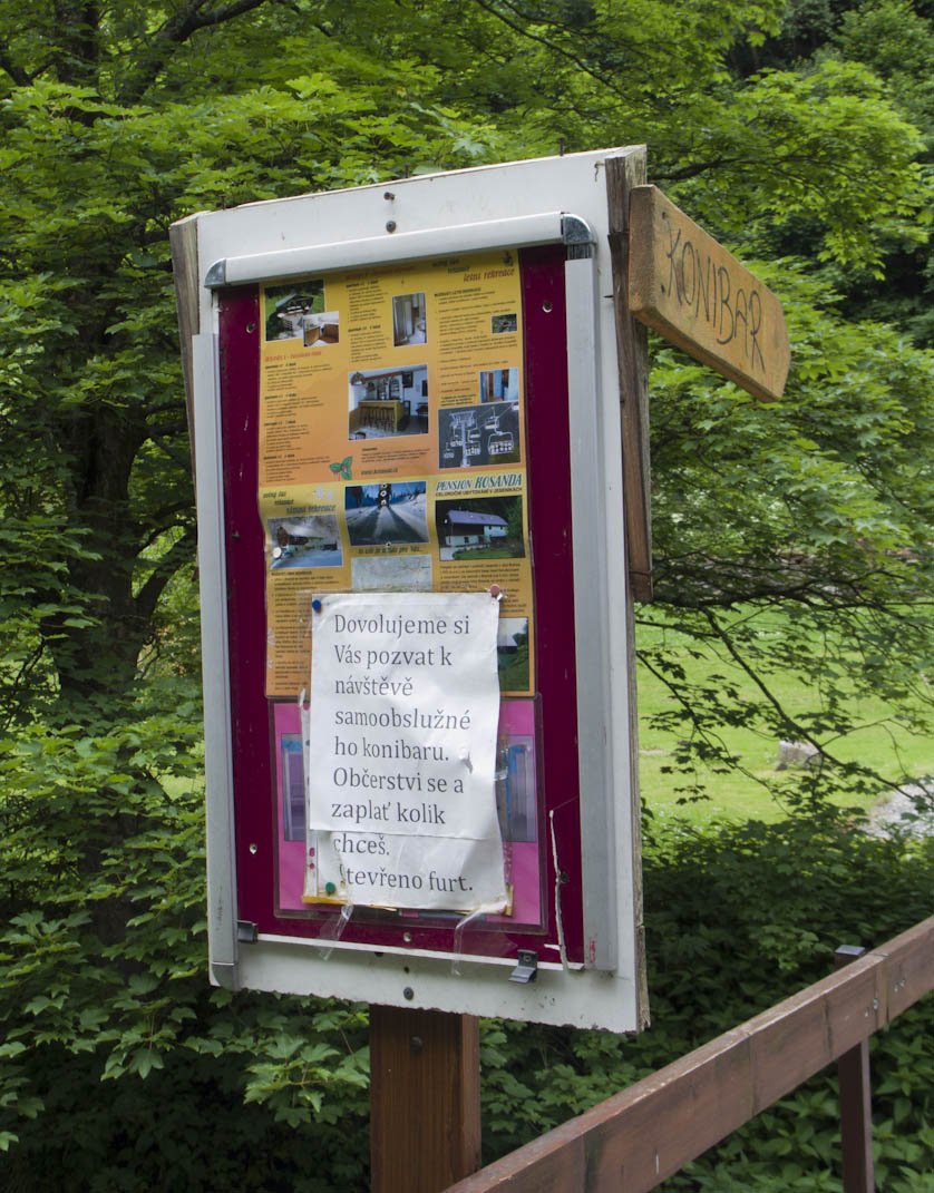 Podle vzoru konibar, tedy bar zde zřizovatel vystavil nějaké láhve, bohužel při autorově návštěvě všechny prázdné. Myšleno ty s alkoholickými nápoji, takže na frťana to nebylo. K dispozici byly jen nápoje nealkoholické, tedy nějaké minerálky. No a šťávu si vozím na kole…