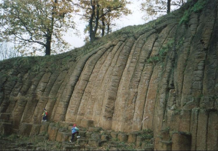 Odkryv lávového proudu, který zvětrává a vytváří sloupce na sebe poskládaných útvarů přípomínající bochníky chleba.