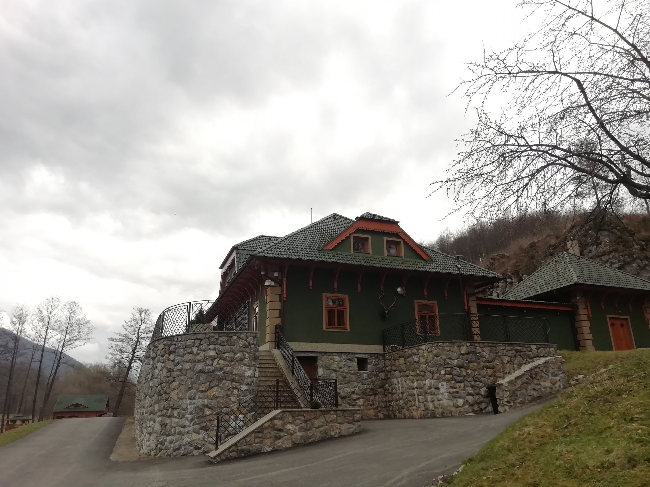 Najskôr sme prešli k tmavozelenej budove. Do jej blízkosti sme sa nedostali, lebo reštaurácia aj celý priľahlý areál boli uzatvorené. Keď som si išla spraviť fotografiu reštaurácie, upútal na malý skalný vŕšok nad ňou - skaly, zeleň a pár stromov vytvorili veľmi pekné miesto. Pekný bol aj potok rýchlo pretekajúci neďaleko budovy. Na internete som sa dočítala, že interier je tematicky zariadený v poľovníckom štýle, o čom už nasvedčuje jeho názov Svätý Hubert, patrón poľovníkov.