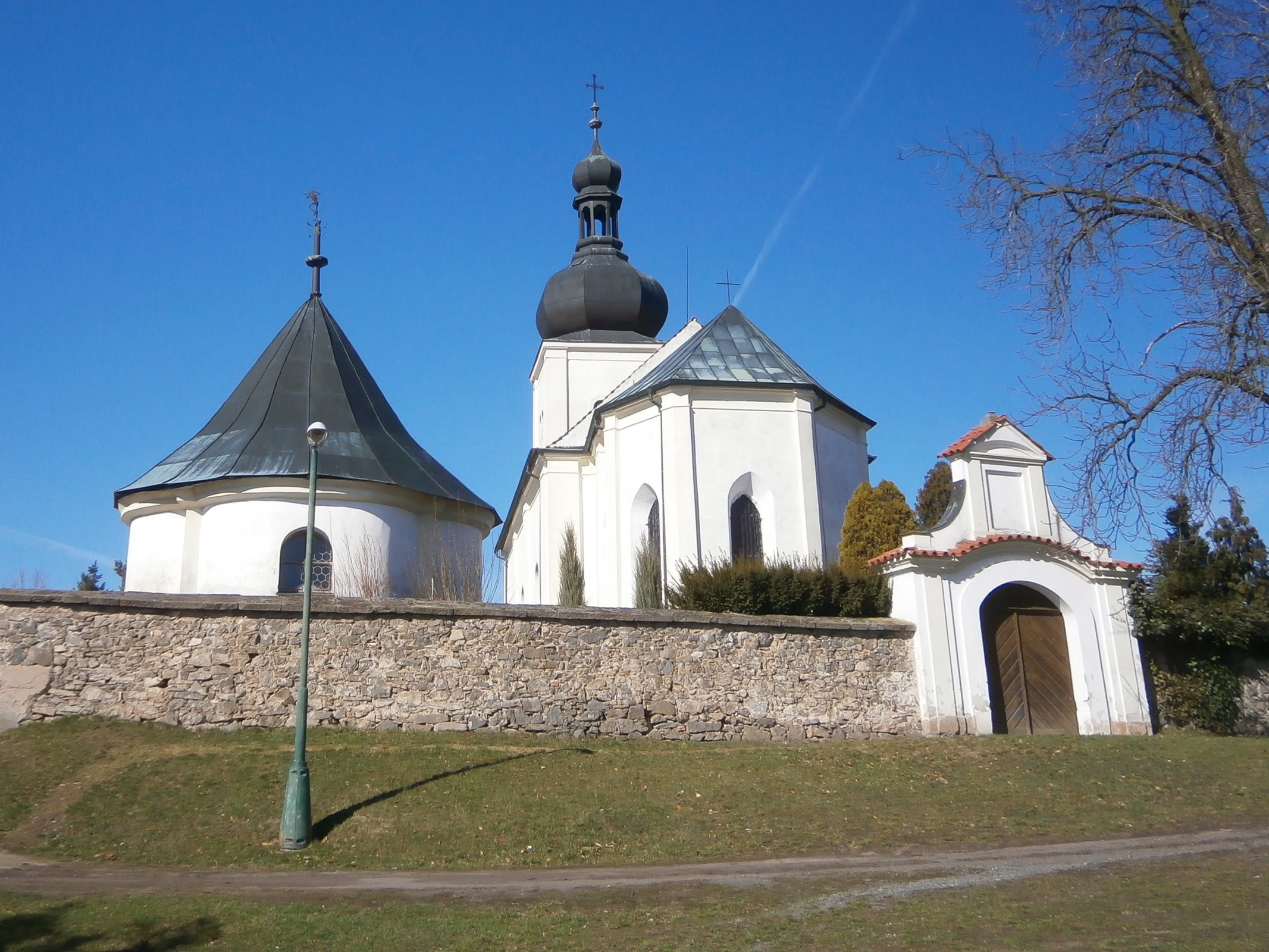Kolem kostela se nachází hřbitov s barokní ohradní zdí, portálovou bránou s kamennými koulemi na vrcholu ozdobeným štítem, výklenkovou kapličkou a okrouhlou márnicí s kuželovou střechou a plackovou klenbou, v níž býval uložen starý oltářní obraz Nanebevzetí Panny Marie, a to vše pochází nejspíše ze 2. čtvrtiny 18. století. Na severní straně pohřebiště poblíž zdi se nachází skromný pomník Dominika a Ignáce Škroupových v podobě železného kříže na pískovcovém podstavci, jenž byl opraven v roce 1897. Na závěr je ještě třeba dodat to, že v roce 1888 bylo kolem kostela objeveno velké pohřebiště z doby bronzové a snad i ze starších údobí.