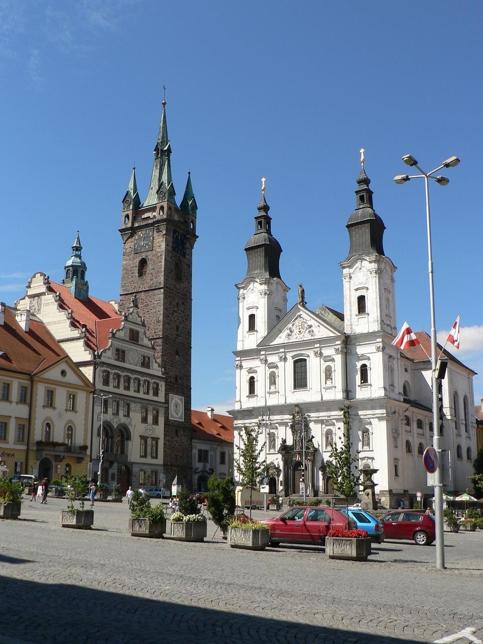 Původní kostel se začal stavět v roce 1656 podle plánů architekta Carlo Luraga. Později do úprav zasáhl architekt G. D. Orsi, za něhož byla stavba v roce 1679 dokončena. Další zásah do vzhledu kostela byl proveden po požáru v roce1689. Oprava byla dokončena až v roce 1717 a tehdy byl znovu vysvěcen. S požáry nebyl konec a kostel byl třikrát restaurován. Bylo to v letech 1868, 1896 a 1942. Svatyně je postavena na půdorysu latinského kříže. V hlavním průčelí mezi dvěma věžemi je průčelí ukončené štítem a rozčleněné římsami s pilastry. Portál je údajně dílem K. I. Dienzenhofera a je z roku 1720. Socha P. Marie byla ve štítu umístěna v roce 1763. Průčelí je dílem sochaře ze Stříbra a bylo provedeno v roce 1734. Samotná loď s postranními kaplemi je zaklenuta valenou klenbou s pásy a lunetami nad křížením kopule. V první třetině 18. století byla provedena štuková výzdoba. Nad kněžištěm je nástropní malba Oslavení P. Marie a v ramenech příčné lodi malby zpodobňují sv. Ignáce a sv. Františka Xaverského. Tyto malby jsou z roku 1716. Vnitřní zařízení je barokní. Kostel je v rohu náměstí v těsném sousedství Černé věže. Klatovy jsou na mapě KČT č. 64 Šumava – Železnorudsko.