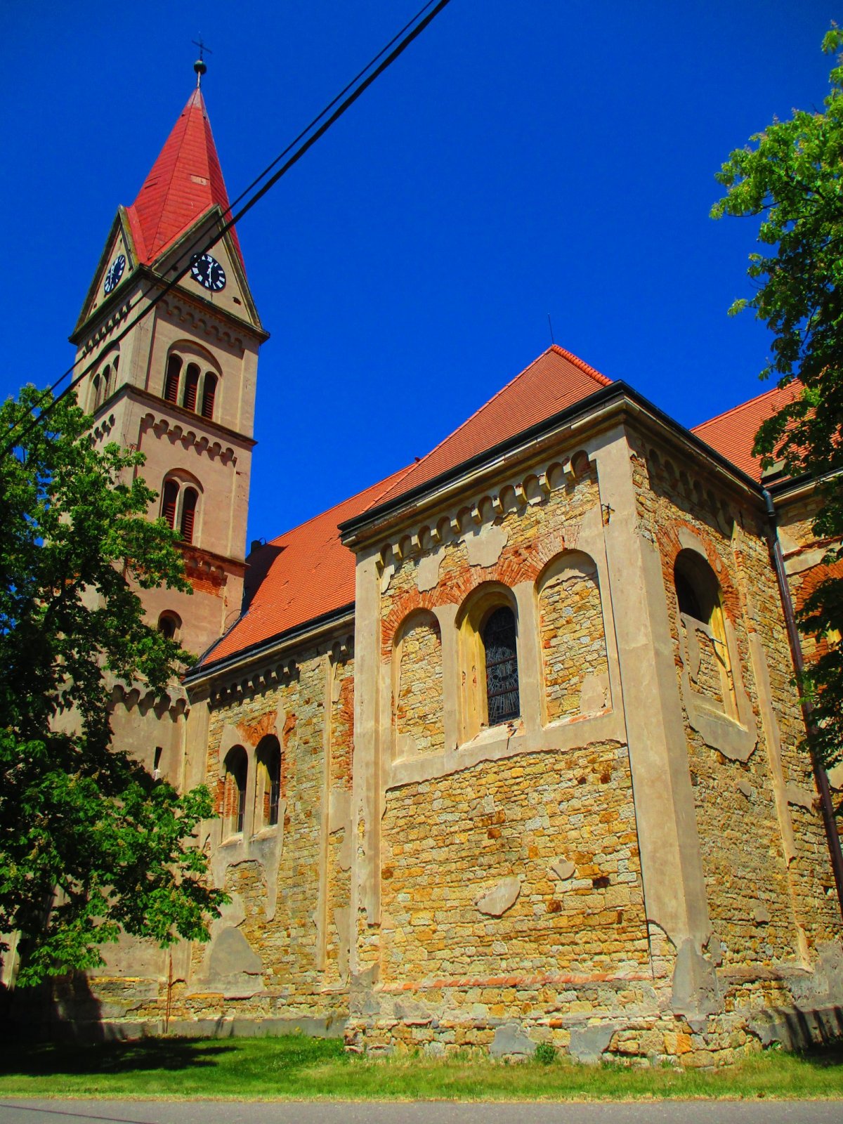 Jedná se o jednolodní zděný přibližně orientovaný kostel s valbovou střechou na půdorysu latinského kříže s užším, půlkruhově zakončeným presbyteriem se štíhlou přes 46 m vysokou hranolovou věží, která je ukončena jehlancovou oplechovanou střechou s hrotnicí, makovicí a drátěným křížkem po jižní straně západního průčelí a opticky výškově členěna lizénovými rámy do 5 pater. Vstupní západní průčelí je po bocích vymezené vysokými dvojstupňovými opěráky a zakončené poměrně strmým trojúhelným štítem. Většinu jeho plochy vyplňuje monumentální ústupkový portál s vloženými sloupky a půlkruhovou profilovanou archivoltou. Vstupní otvor má přímé nadpraží s koutovými konzolkami a vedou k němu 4 kamenné stupně venkovního schodiště. V tympanonu je umístěn reliéfní medailon anděla. Kruchtu v ose průčelí osvětluje velké kruhové okno v mírně rozevřené špaletě, s nepůvodním luxferovým zasklením. Boční fasády jsou členěny soklem, lisenovými rámy s obloučkovým vlysem a zakončeny profilovanou římsou. Okna hlavní lodi jsou po dvou sdružená, ve špaletě s půlkruhovým zakončením. Presbytář s opěrnými pilíři po stranách člení trojice lisenových rámů obloukovitě zakončených, v krajních jsou vložena okna. V ose závěru je umístěn zadní vstup v sedlovém neprofilovaném portálku.