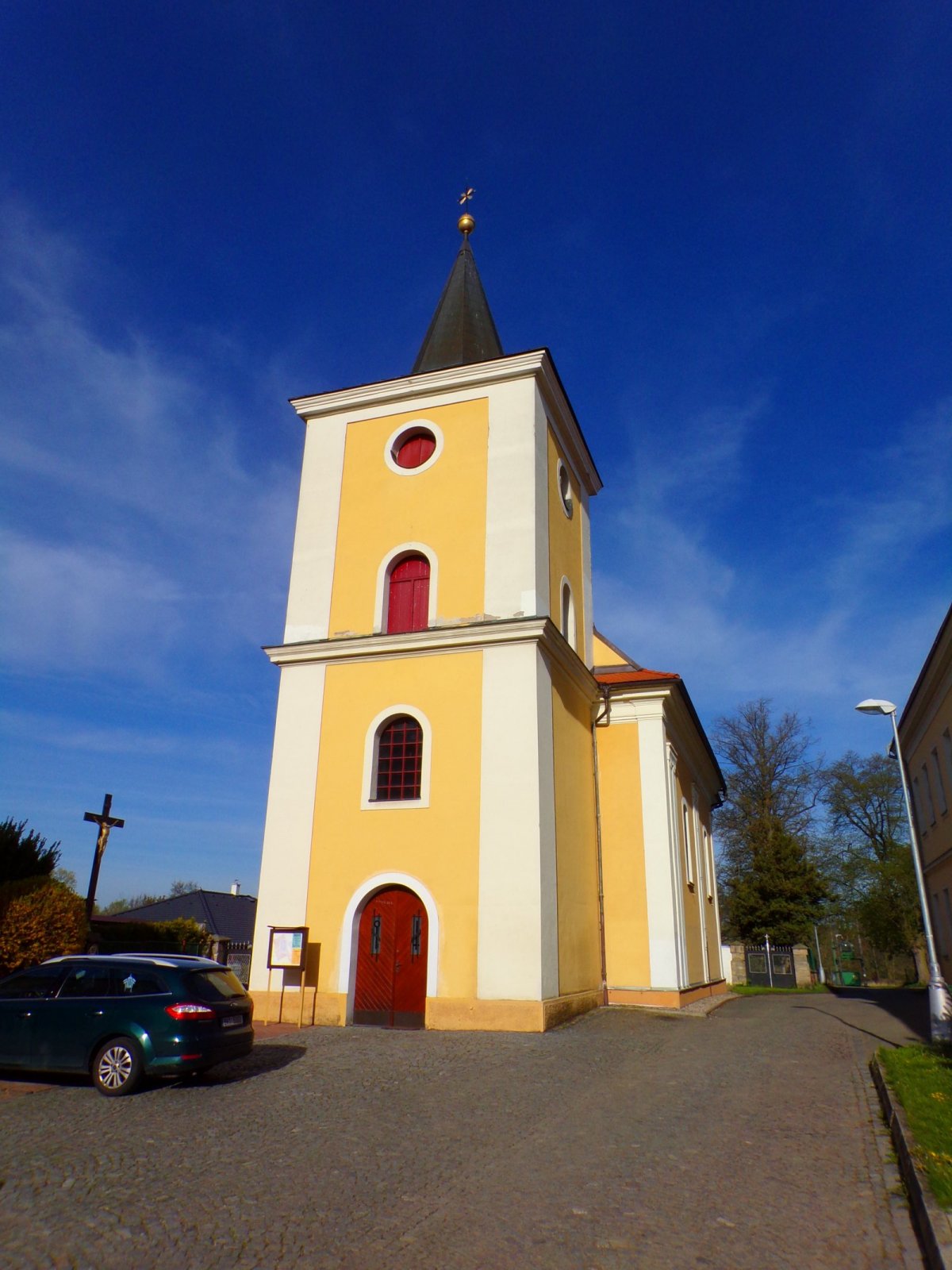 Jeden vchod do kostela vede věží, druhý je na severní straně lodi. Zcela jednoduchá, cihelná a omítaná budova k západu obrácená byla vystavěna nákladem Matice náboženské a tvoří ji krátká loď o 2 polích, k níž se na západ pojí presbytář o jednom poli s eliptickým závěrem a malou sakristií na jih. Před východním průčelím je přistavěna jednopatrová věž, v přízemí rustikovaná, v patře obrněná na rozích toskánskými pilastry. Okna jsou ve věži svrchem půlkruhová, jedno je nad vchodem a po jednom v 1. patře na třech stranách. Pod hlavní římsou věže je na každé straně po kruhovém okně. Podélné zdi lodi jsou prolomeny 2 páry segmentových oken s ostěním a závity v rozích. Kněžiště je osvětleno jedním párem oken stejného tvaru jako v lodi.