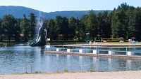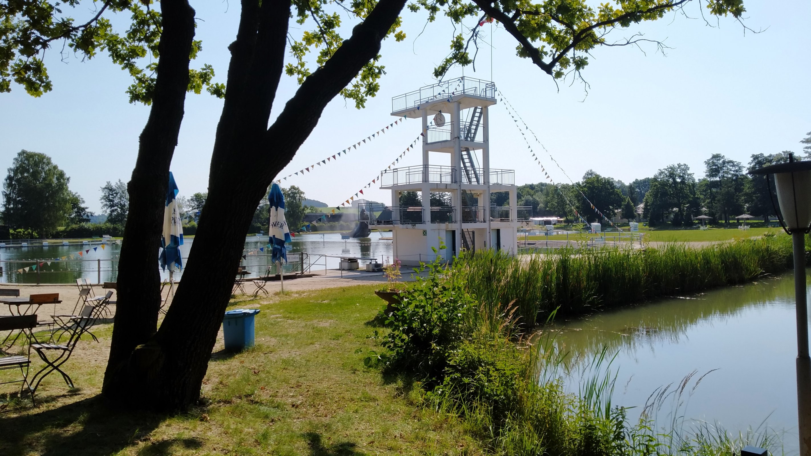 Historické lesní koupaliště má 10 metrů vysokou skokanskou věž, mroží skluzavku a vodní bahenní hřiště.