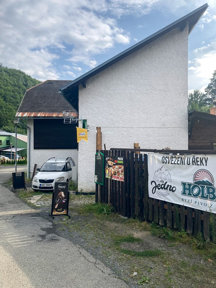 Nová „restauratér“ je naštěstí ještě v rozpuku sil, takže původní prostor nálevny (hlavně terasu) poněkud rozšířil. Kromě hlavní činnosti, tedy poskytování nějakých tekutých posilňovačů naštěstí nabízí i něco k zakousnutí, povětšinou i nezdravé (víz v galerii bůček…), utopenec, párek, nějaká polévka.