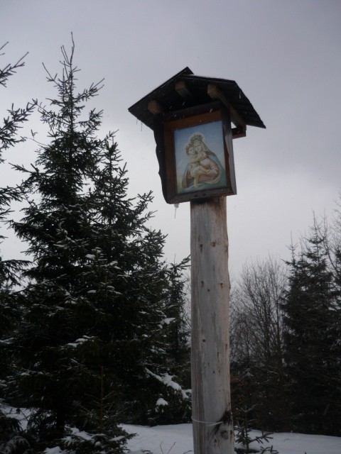 Rozcestí U obrázku najdeme nad Kouty nad Desnou pod přečerpávací nádrží Dlouhé stráně. Je to rozcestí, kde opravdu je obrázek a slouží jak pěším, taK cykloturistům, tak běžkařům. Z Kout je to 4,5 km (do kopce) a do Loučné nad Desnou od rozcestí 5,5 km.