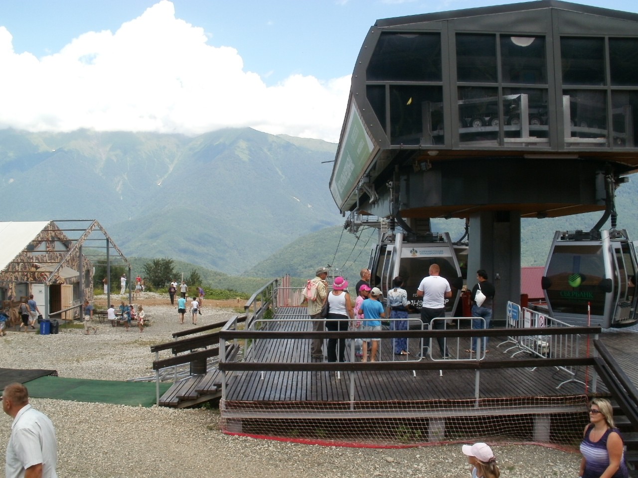 V Krásné Poljaně nebylo v létě 2011 co prohlížet. Samé staveniště. Využili jsme možnosti vyjet si lanovkou do kopců. Platili jsme 700 rublů a tři kabinkové lanovky po osmi lidech nás postupně vyvezly do výšky 2400 metrů.