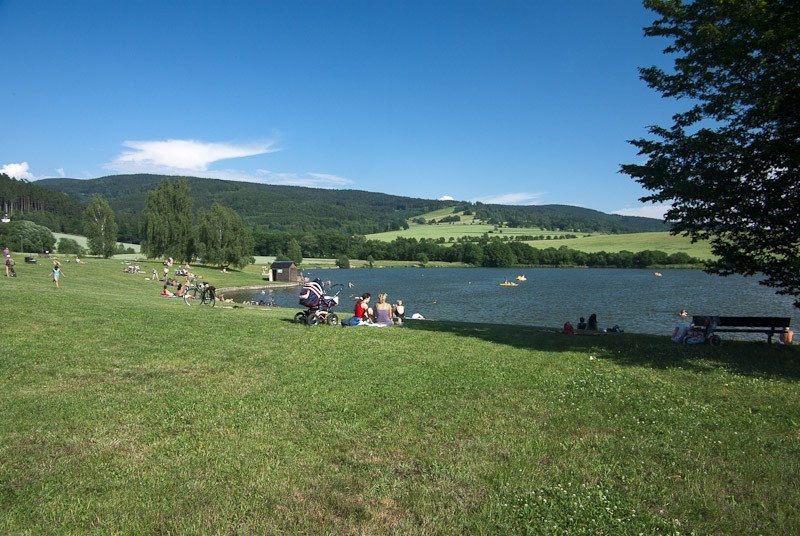 Na nádrži si dávají dostaveníčko i windsurfeři, v půjčovně se dá nasednout na šlapadlo a kolem břehů posedávají i lidé s udicemi.