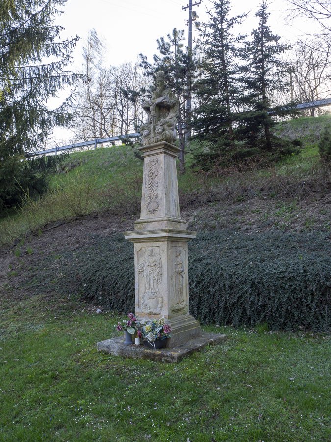 Nicméně vraťme se ještě k základu. Na čtvercové kamenné desce je umístěn nižší kamenný základ, která pokračuje o něco užším hranolovým podstavcem z reliéfy svatých. Nejčestnější čelní stranu zdobí vyobrazení Panny Marie. Tu bychom mohlo považovat za Immaculatu, stojí na zeměkouli, kterou obtáčí had – Ďábel, kterého nohou drtí. Bohorodičku doprovází dvojice andílků. Na pravé straně podstavce je reliéf sv. Rocha v poutnickém dlouhém kabátě a holí. Na levé straně podstavce je reliéf sv. Ondřeje, který stojí před křížem ve tvaru X.