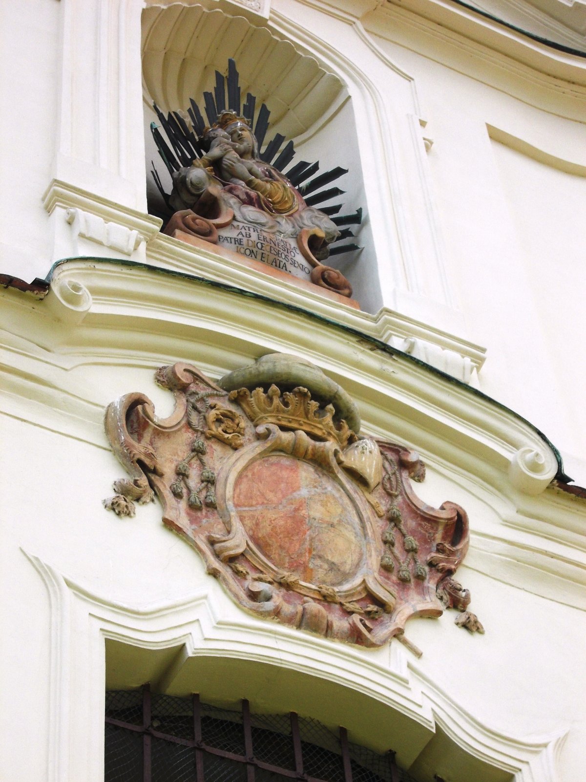 priečelie kostola - kamenná kartuša a soška Pasovskej madony  autor: ivetka
