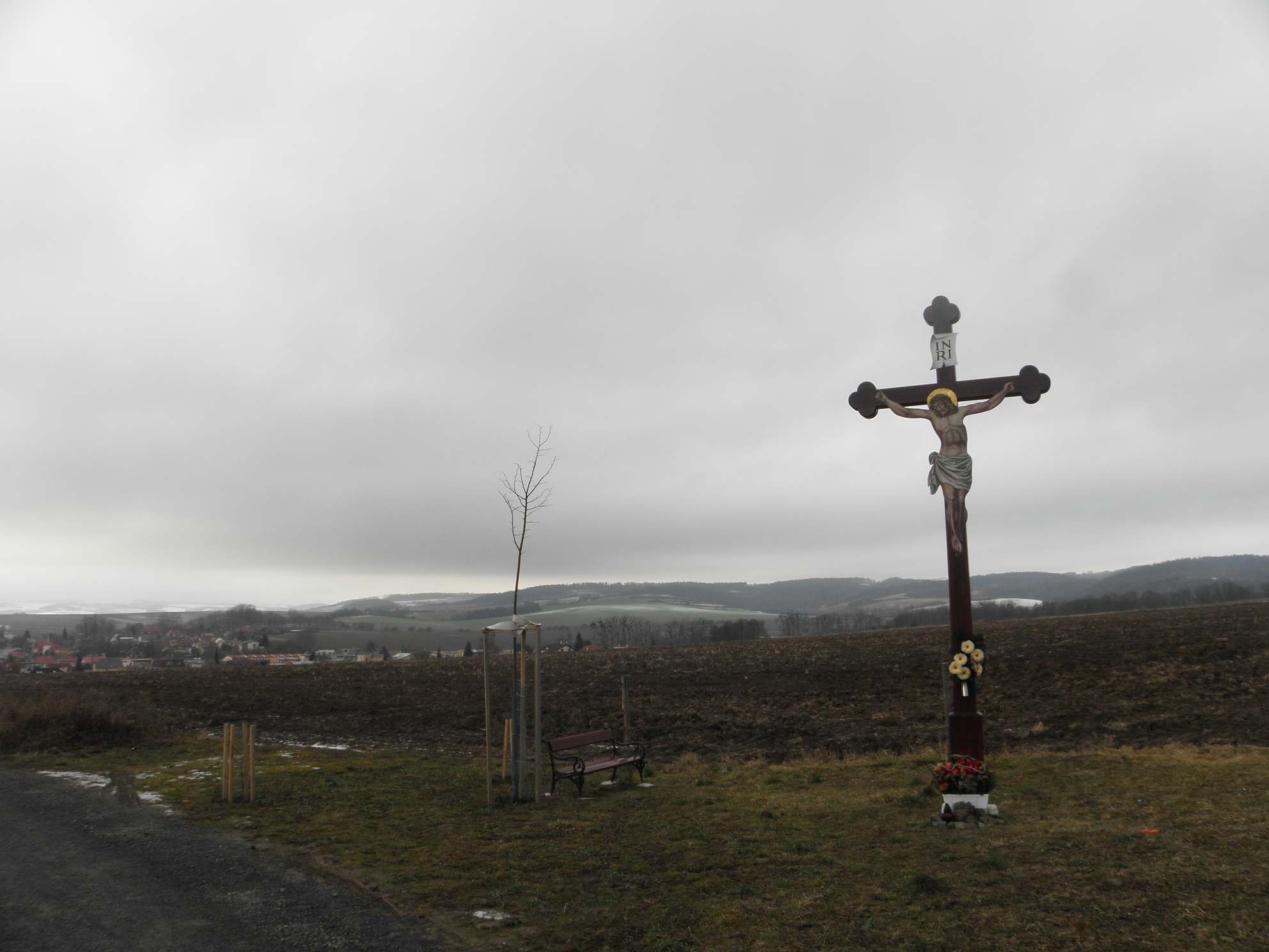 Dřevěný hranolový kříž s plechovým korpusem ukřižovaného Ježíše Krista stojí na tomto místě teprve od roku 2010, kdy byl obnoven. Nejprve stával asi o 50m blíže silnici z Fulneku do Bílovce.