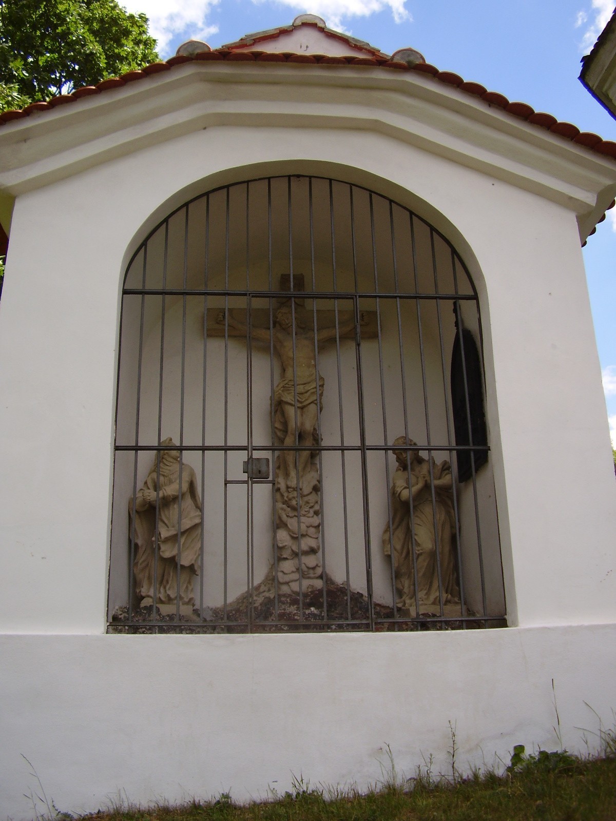 Křížová cesta pochází ze 2. poloviny 18. století a je tvořena drobnými výklenkovými kaplemi, které původně všechny obsahovaly kamenné sochařské pašijové scény, z nichž je dnes na místě pouze torzo, přičemž další sochy jsou (či alespoň v době naší návštěvy byly) umístěny v předsíni kostela sv. Petra a Pavla na náměstí.