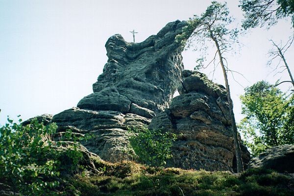 Štíhlá pískovcová skalní věž vyčnívá z borového lesa vysoko nad jižním okrajem osady Naděje. Podle původního německého jména Rabenstein se někdy označuje jako Krkavčí nebo Havraní skála. Nejčastěji se ale užívá názvu Křížová věž, podle kříže na jejím vrcholku. Železný kříž na vrcholu skály dali v roce 1833 údajně postavit pánové Schiecht a Wiesner, majitelé továrny v Antonínově Údolí. Koncem 19. století odtud svítila lidem do údolí lucerna, kterou sem každý den za soumraku vynášel místní tkadlec Josef Weiss. Světlo zde rozsvěcoval více než třicet let a přestože je vrchol nesnadno přístupný, i v zimě se mu vždy podařilo světlo bezpečně vynést nahoru. Po jeho smrti se této tradice již nikdo natrvalo neujal. Ještě ve 20. letech svítívalo světlo do kraje alespoň o velikonocích, ale po válce tento zvyk nadobro zanikl. Kříž později někdo shodil a teprve v roce 1978 byl opět upevněn na původní místo na vrcholu (další informace najdete v článku Karla Steina).