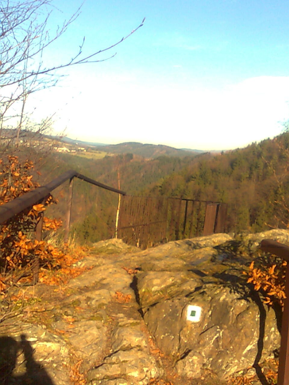 Čedičový skalní útvar (478 m n.m.) nad soutokem Jizery a Kamenice na svahu vrchu Medenec (543 m n.m.) má několik pojmenování. V novodobých mapách je upřednostněn název Myší skála. Na 25 metrů vysoké skalní věži tyčící se nad Riegrovou stezkou je přístupná vyhlídka s pěkným výhledem na Železnobrodsko. V době naší návštěvy žel nebyla viditelnost taková, jakou bychom si přáli. …
