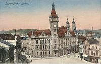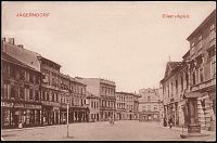 Na protilehlé straně současného náměstí vidíme podlouhlý Oberring. Poměrně velký blok domů je k vidění na severovýchodní straně náměstí, jihozápadní část je pak členěna do dvou meších bloků , rozdělených menší uličkou. Ta menší ulička je dnešní ulice radniční, která odděluje menší blok domů, kde už od středověku měli „Jägerndorfští“ svou radnici. Ta tu stojí dodnes. Tím jsme ale rovnou u stave, které jsou kolem Hlavního náměstí k vidění. A protože radnice je nejviditelnější, začneme rovnou u ní. Současná radnice s tou středověkou (kromě místa) nemá moc společného. Jde o stavbu realizovanou počátkem 20. století a dodejme, že jednu z nejopěvovanějších staveb města. Krnov (něm. Jägerndorf) byl tehdy centrem textilního průmyslu a díky tomu do městské pokladny přitékaly nemalé peníze. Radní se usnesli, že si zaslouží lepší úřadovnu (když i okolní části města zdobily honosné vily podnikatelů). Radnici postavenou na poněkud nepravidelném půdorysu zhruba tří křídel je reprezentativní ukázkou tehdy převládající secese a za jejím vzhledem stojí návrh architekta Moritze Hintragera. Ovšem samotná radnice (část v červených až růžových odstínech byla spíše neorenesanční. V letech 1906–7 byl komplex budov doplněn projektem Franze Blasche do zelena laděnou budovou Městské spořitelny, která volný prostor doplnila a právě průčelí obrácené do náměstí dodalo celé radnici na velkoleposti. Dnes patří tato část budovy České spořitelně.