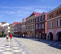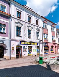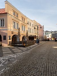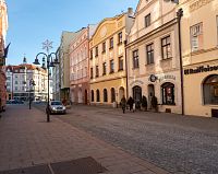 Pokračujeme po západní straně, hned na kraji je zajímavá budova s hrázděným členěním patra pod střechou. Dále pokračuje seskupení v podstatě novodobých budov, kde ovšem stavitelé zachovali zhruba členění původní zástavby (i s moderním podloubím). Původně byl hlavním objektem obchodní dům Prior. Dnes tu jsou stále nějaké obchodní prostory spolu s kavárnou nebo občerstvením.
