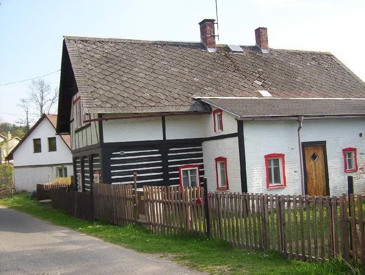 Lidová architektura: Dům, jehož obytná část je roubená s podstávkou a hospodářská část je zděná (obvykle z kamene, v tomto případě zřejmě z pískovce, který bylo možné těžit v nejbližším okolí)