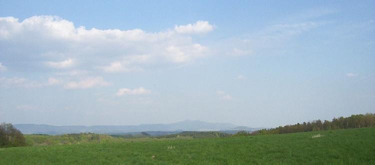 Pohled na západ: Krajině kolem Kunratic vévodí hlavně kuželovité kopce Lužických hor; na západě to je především Klíč (759 m. n.), hora která nabízí nádherný kruhový výhled, protože na sklanatém temeni a kamenném moři pod vrcholem se neuchytila žádná
