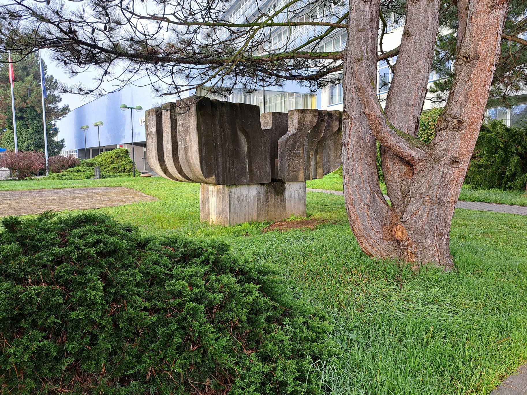 Na Havlíčkově ulici v Kyjově jsem objevil před objektem č.180/18 zajímavou plastiku. Betonová plastika je osazena na nízkém soklu před vstupem do administrativní budovy sklárny. Hlavním autorem uměleckého díla je Vjačeslav Irmanov a dalším autorem je Jaroslav Kadlec.