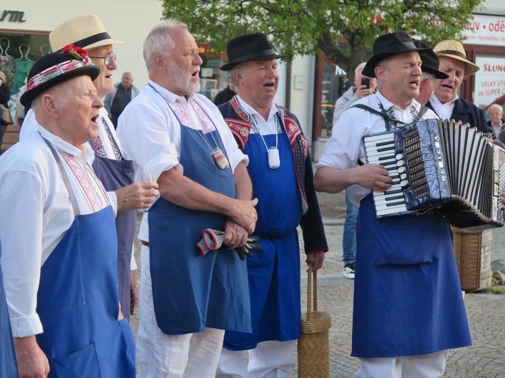 Pokud mě paměť neklame, jedná se dnes o skupinu 22 „posledních statečných“ krojovaných a nás přespolní ze všeho nejvíce (a docela nemile) překvapilo, že – přes příjemné jarní počasí a vstup volný – bylo „herců“ u vysokého kmene bez kůry snad i o něco málo více než přihlížejících diváků.