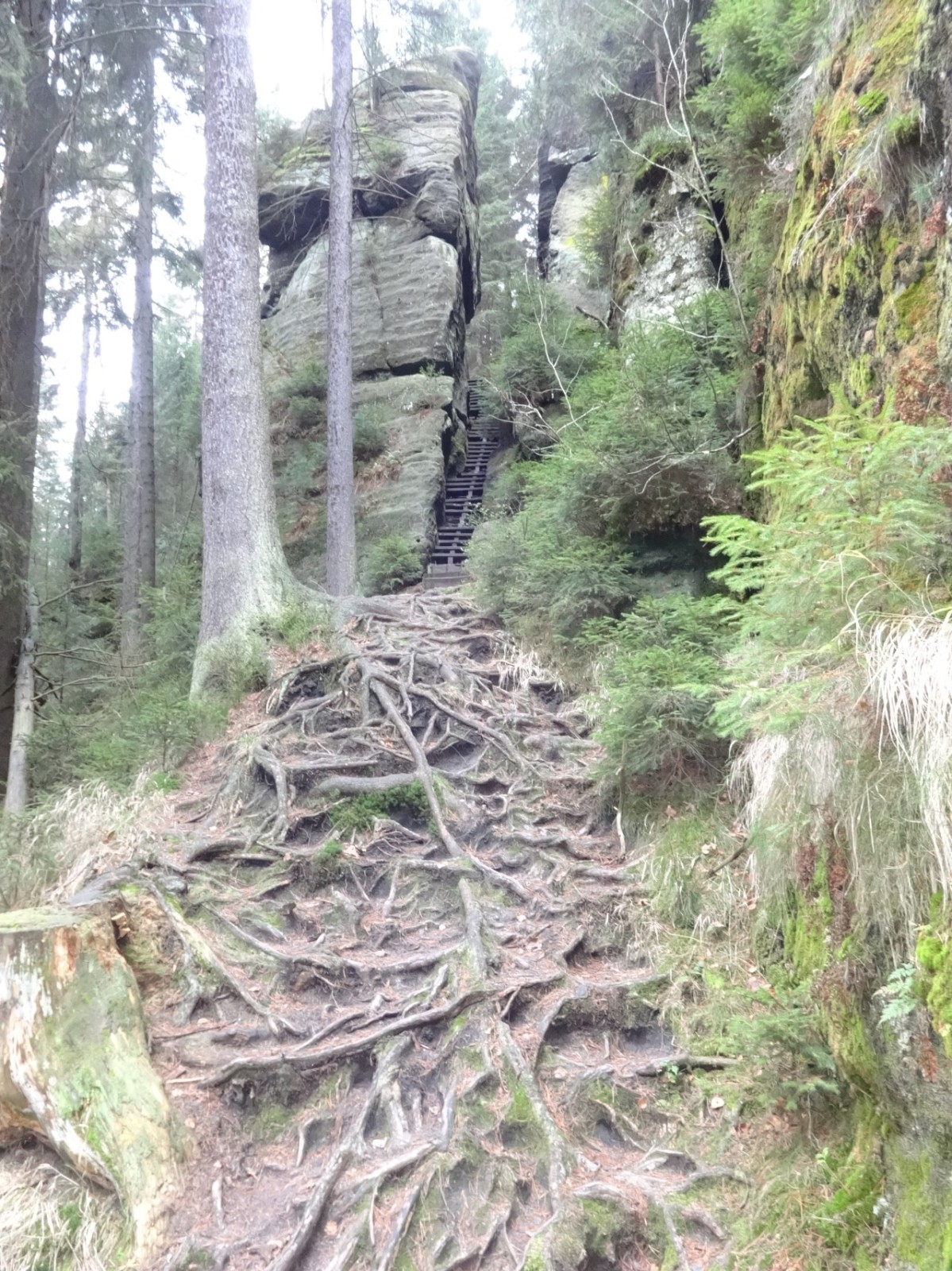 Mezi mohutnými pískovcovými skalami se občas otevírají ústí menších postranních roklí, kudy vedou odbočky na přírodní cesty do skal. V jednom takovém místě se i já vydávám vzhůru, asfalt měním za krátký úsek pěšiny plné kořenů, abych pokračoval po dřevěných schodech uchycených na ocelových profilech. Vzhledem k některým prohnilým stupňům se jedná o „chvilky odvahy a dobrodružství“. Možná i proto někdo záměrně odebral označení odbočky tímto směrem.