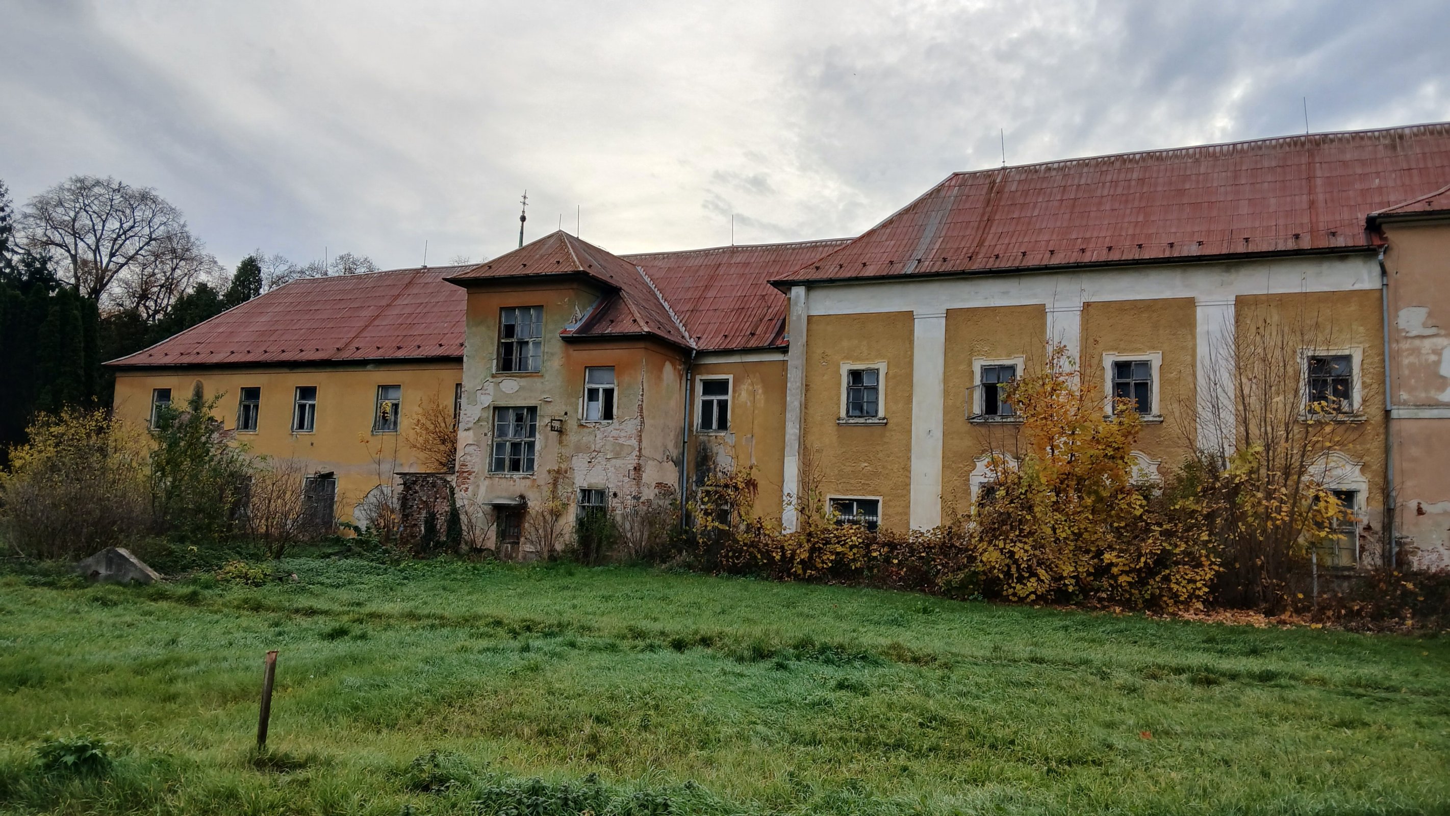 Zaparkovali sme oproti kostolu a už pri vystúpení z auta sme uvideli veľký kaštieľ v úbohom stave. Prešli sme k bráne a pred nami sa objavila jeho severná časť s rizalitom s balkónom v jeho strednej časti, ktorý dal postaviť na konci 19.storočia vtedajší majiteľ Adolf Schrenk. Aj značná časť tejto strany kaštieľa bola v nezáviodeniahodnom stave. Až na konci severnej strany sme videli opravenú časť kaštieľa s nárožnými vežičkami nachádzajúcimi sa v západnej časti kaštieľa. Aj túto časť dal prestavať Schrenk. A práve táto západná časť kaštieľa je po rekonštrukcii a slúži aj k ubytovaniu hostí. Oproti sa nachádza ďalšia budova po rekonštrukcii, ktorá slúži ako kaviareň a nesia názov Kaviareň u sv. Vincenta. Okolie kaviarne bolo pekne upravené a keďže bol akurát čas dušičiek bola kaviareň a jej okolie náležite vyzdobené. Veľmi sa nám tu páčilo. Dali sme si aj netradičné zákusky a posedeli na vonkajšej terase. Návštevníkov tu bolo veru dosť, bola nedeľa a tak si domáci i cezpolní prišli toto miesto pozrieť.