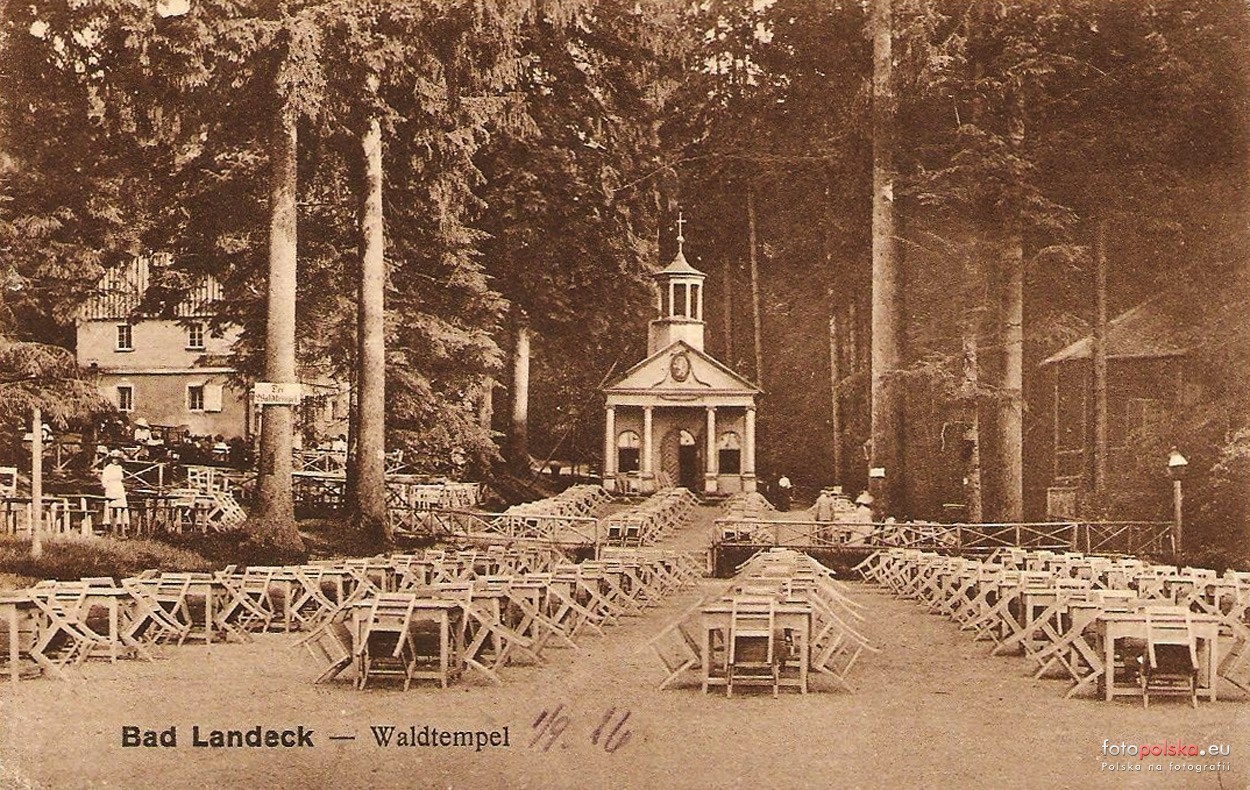 Informační tabule v ulici Moniuszka v lázních Lądek-Zdrój připomíná slávu někdejší lesní svatyně, která vítala mocné tohoto světa. Dřevěná stavba postavená na obdélníkovém půdorysu připomínala malý řecký chrám. A to díky svému průčelí, v němž trojúhelníkový tympanon podpíraly čtyři sloupy s jónskými hlavicemi. Na sedlové střeše vynikala osmiboká věžička. Ta však byla dostavěná až později, když se romantický chrámek přeměňoval na svatyni.