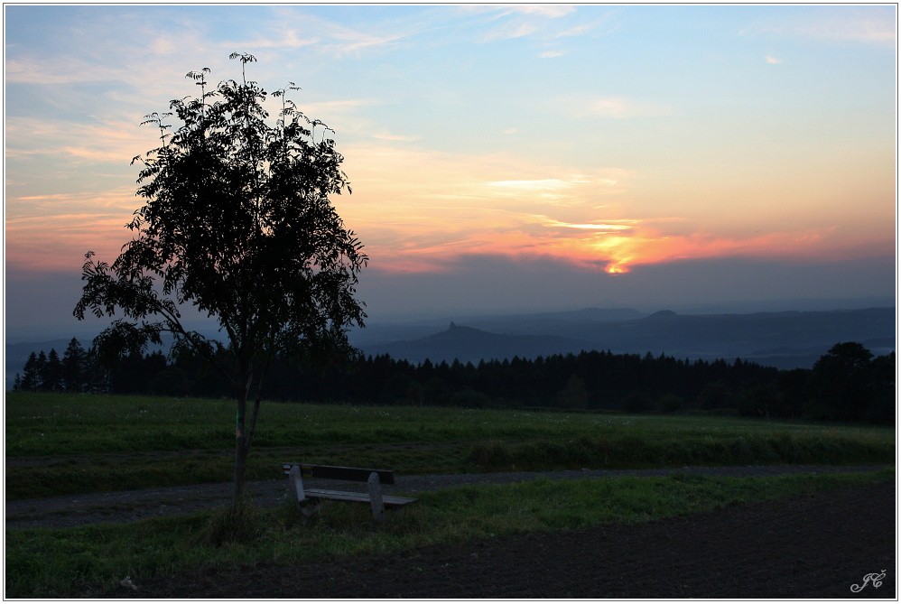 Okolí Lomnice nad Popelkou je proslulé svojí bohatou "úrodou" polodrahokamů, zejména achátů a ametystů. Stačí, aby zemědělci na podzim nějaké pole zorali a hned na ně vyrazí hledači. Hledání polodrahokamů je samozřejmě atraktivní i pro děti a tak není divu, že když jsme se před mnoha lety před dcerami zmínili, že bychom si mohli zajet nějaké nasbírat, překonaly svoji vrozenou lenost a nechuť kamkoliv chodit a vyrazili jsme. Autem na Košov a dál po polích už pěšky. Když chodíte po oranici a každou chvíli se shýbáte pro "poklad", je to docela namáhavý tělocvik a není tedy divu, že po dvou hodinkách bolí celý člověk. Ideální stav pro svačinku a k tomuto účelu jsme hned poprvé objevili tuto lavičku. Holkám to bylo fuk, ale mě s manželkou ten pohled do kraje už tehdy doslova okouzlil a od té doby nemine rok, aniž bychom si na lavičku sedli. Před dvěma lety jsme si dokonce naplánovali výlet tak, abychom mohli z lavičky pozorovat podzimní západ slunce a k autu už jsme šli za tmy.