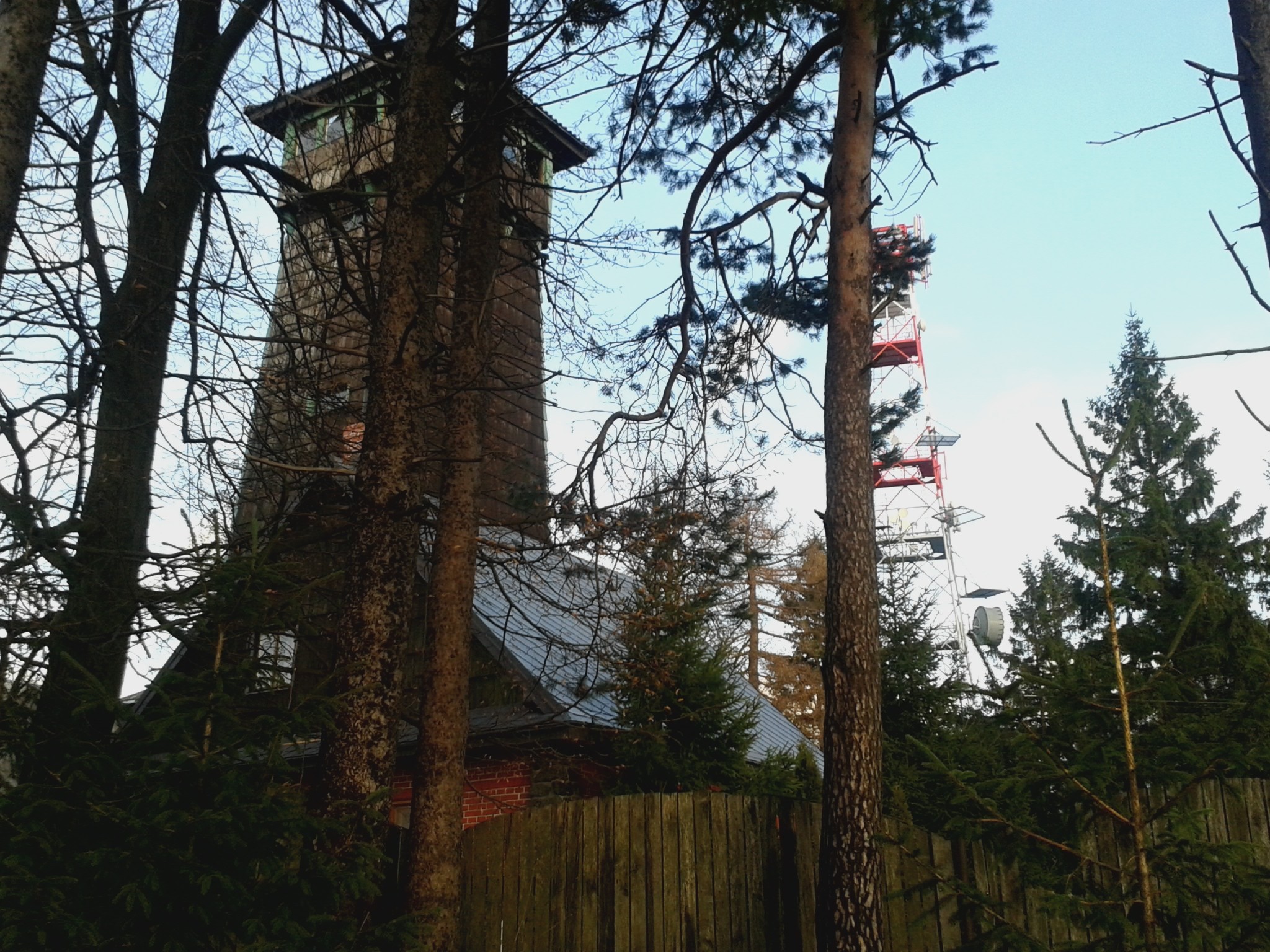 Za rozhlednou pak stojí vysílač jednoho mobilního operátora a kousek pod ním pak soukromé stavení. A tady prochází turistické značky KČT.