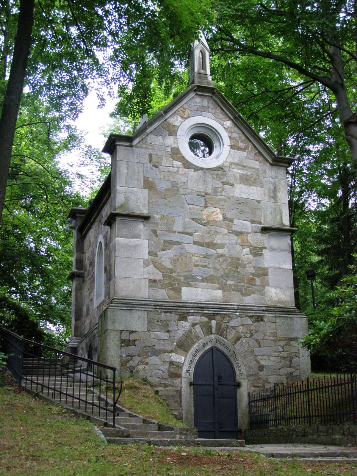K novogotické kapli (hrobce) Vincenze Priessnitze dojdeme po lázeňské Kolonádě, nalézá se cca 200 metrů od Českého pomníku. Se stavbou posledního odpočinku Vincenze Priessnitze bylo započato v roce 1853, téhož roku byla pod kapli uložena rakev s ostatky, které byly přeneseny ze starého hřbitova, kde byl Vincenz Priessnitz původně pohřben. Uloženy jsou zde i ostatky manželky Sofie a dcery Karolíny. Nad vstupním portálem je německy psaný nápis Místo odpočinku Vincenze Priessnitze.