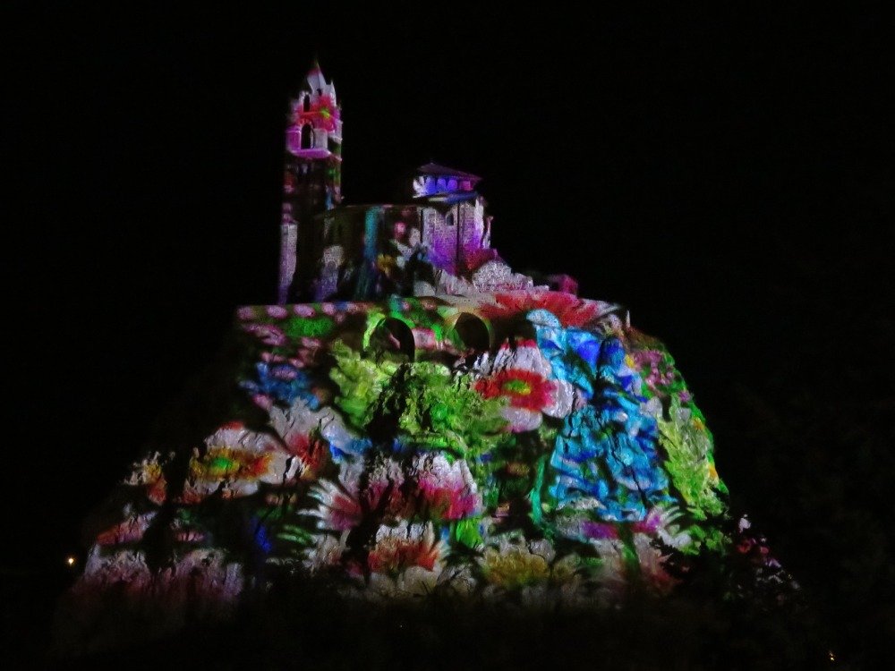 Ve většině případů má nasvícení svůj vlastní příběh a hudební doprovod. Absolutním vrcholem a nezapomenutelnou záležitostí je bezesporu promítání pseudohistorické „koláže“ na téměř 90 m vysokou skálu sopečného původu Aiguilhe, na jejímž vrcholu se tyčí kaple či kostelík Archanděla Michaela. Celé toto promítání trvá asi tři hodiny a doprovází ho Vivaldiho Čtvero ročních období (autor článku si tuto neobyčejnou atrakci během noci zopakoval asi 5x, a to z různých míst a úhlů pohledu, takže v podstatě celá fotogalerie je soustředěna pouze na tuto část programu).