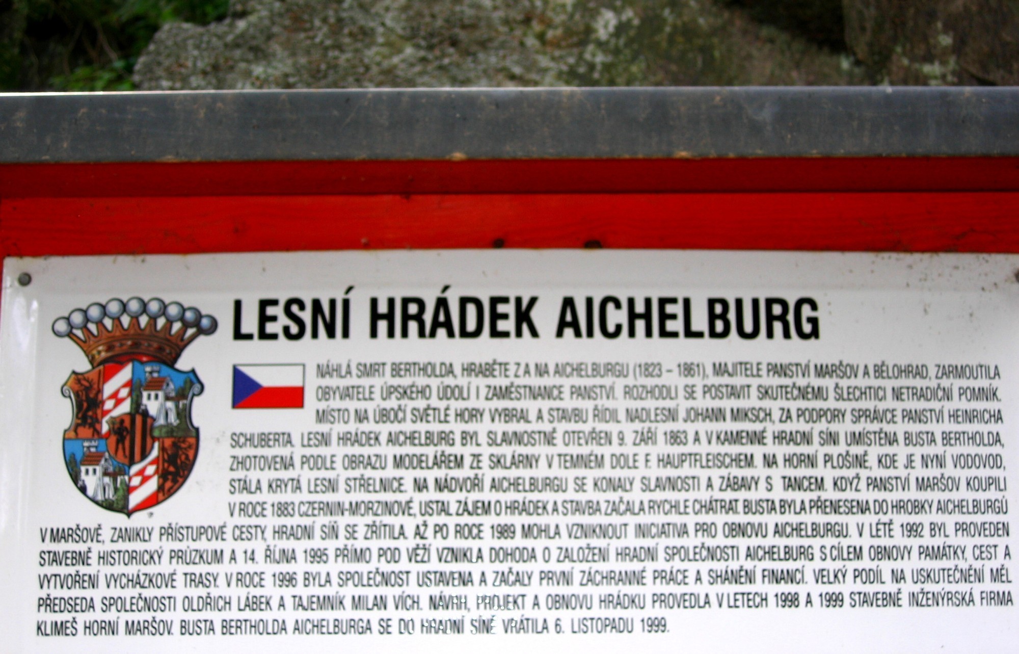 Zřícenina lesního hrádku Aichelburg je zajímavou ukázkou romantického životního stylu 19. století. Lesní hrádek vybudoval vroce 1863 lesní personál velkostatku Maršov dva roky po smrti bývalého majitele panství Bertholda Aichelburka. Chtěl tím vzdát hold tomuto osvícenému šlechtici, který se významně zasloužil ozlepšení životní úrovně svých poddaných arozvoj průmyslového podnikání na Maršovsku. Hrádek napodoboval středověké tvrze, do hlavní haly se vstupovalo znádvoří přes příkop po padacím mostě. Zhaly se vstupovalo na vyhlídku na věži. Klenutý sklep sloužil jako stáj pro dva poníky. Později zde byl zřízen občasný hostinec ana nádvoří aokolních terasách se tancovalo. Už vroce 1875 byl objekt zpustlý. Vroce 1901 se již hovoří ohrádku jako ozřícenině. Vsoučasné době je hrádek opraven azpřístupněn veřejnosti.