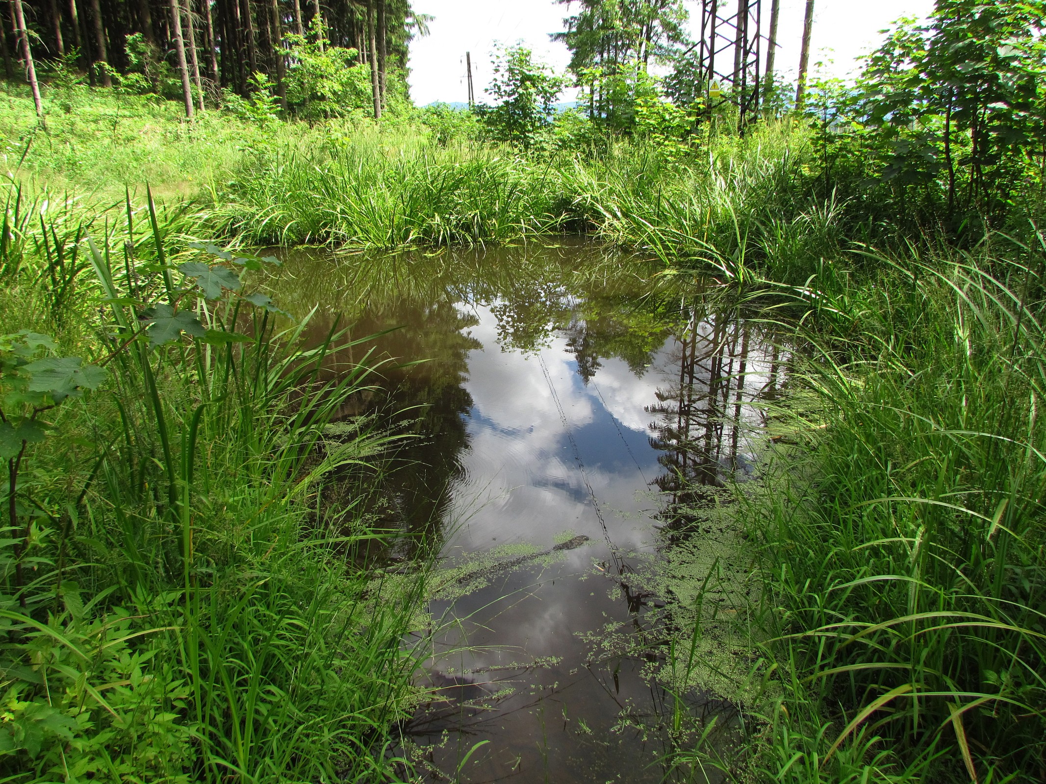 No, jezírko... oficiálně je to lesní tůň, ležící v sedélku Bátrnka mezi skalnatými Vrchy Klenovem (666 m) a Štípou (707 m). Navíc byla před rokem 2000 uměle rozšířená členy Českého svazu ochránců přírody z valmezu. Ti ji napřed ručně prohloubili, ale protože to nestačilo, přišel ke slovu i bagr. Dnes už po těch zásazích není okolo vodní plochy ani stopy a ona je naopak obklopena rozkošným lesním porostem a mokřadní flórou. Ptáte se – proč na tomhle místě tolik lidského úsilí? Tůň s močálem se stala velmi cenná z důvodu výskytu velkého množství obojživelníků, stahujících se sem v době rozmnožování z blízkého i vzdálenějšího okolí a ze všech světových stran. Můžeme se zde setkat se skokanem hnědým i štíhlým, ropuchou obecnou, kuňkou žlutobřichou a čolkem horským. K vidění jsou tu také tvorové, známí jako bezobratlí. Nejkrásnější spatřené exempláře patří k vážkám ploským a šídlům modrým.