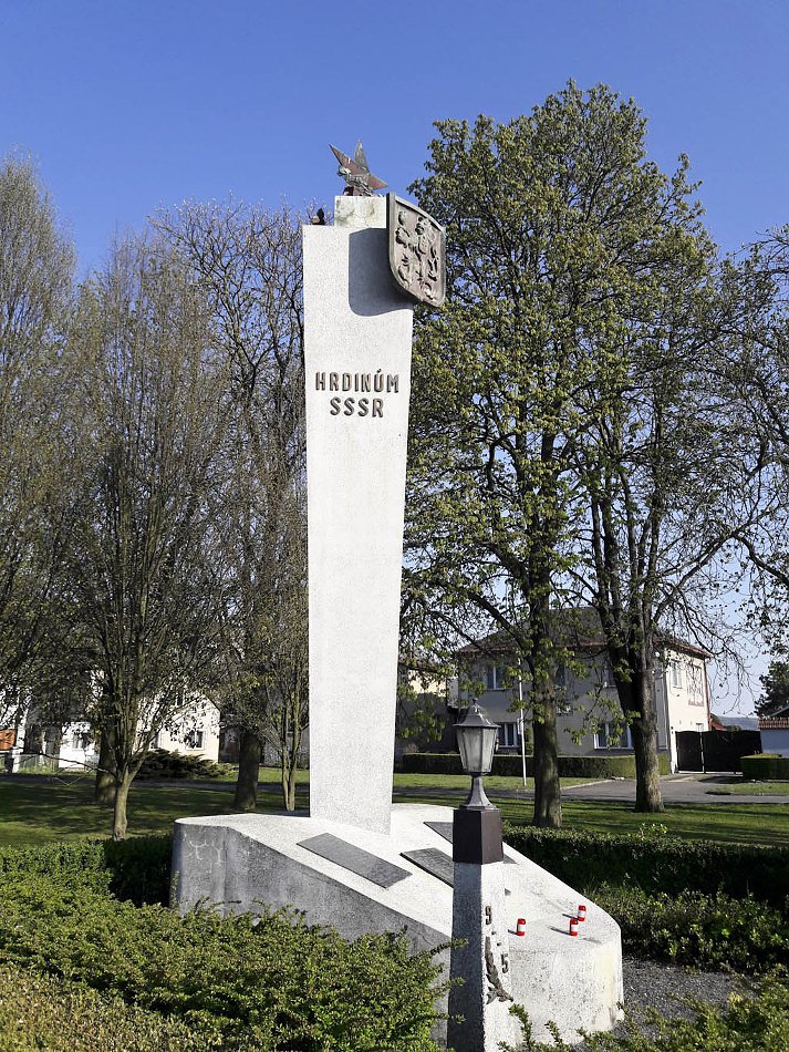 Na soklu jsou umístěny bronzové desky. Střední deska je věnována památce 16 padlých rudoarmějců a 8 místních občanů, kteří zahynuli v posledních dnech války. Signatura 1951/Václav Brzobohatý prozrazuje autora pomníku.