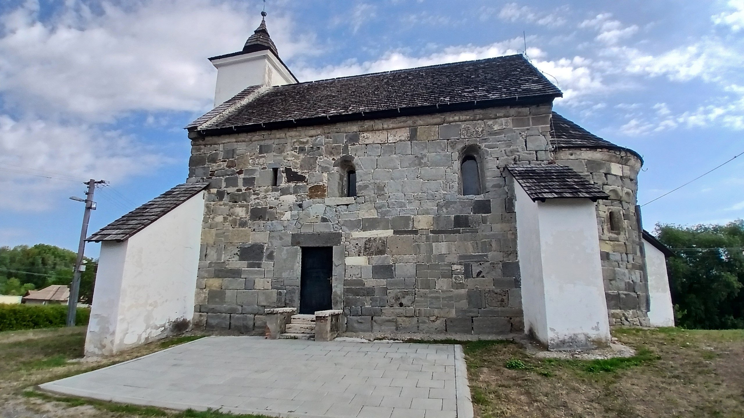 kostolík na miernej vyvýšenine s pokosenou trávou a niekoľkými poľnými kvetmi