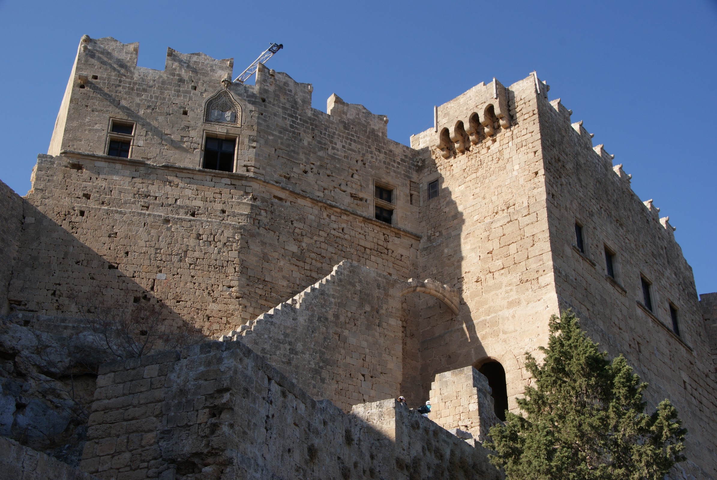 Do hradu dnes vstupujeme po schodišti, které vede od tribuny s reliéfem řecké lodi ke Guvernérskému paláci, původně tvořeném třemi budovami, z nichž jen dva objekty zůstaly zachované. A je zajímavé, že jednotlivé informační prameny se naprosto nejsou schopny shodnout na tom, jestli se jedná o schodiště moderní, středověké nebo antické z 2. století př.n.l. Již v dobách byzantské nadvlády byl postaven v tehdejší malé pevnosti na Akropoli Kostelík, který pak johanité v následujících stoletích přebudovali na hradní kapli. Její pozůstatky zde – nedaleko vstupní brány – stále přežívají.