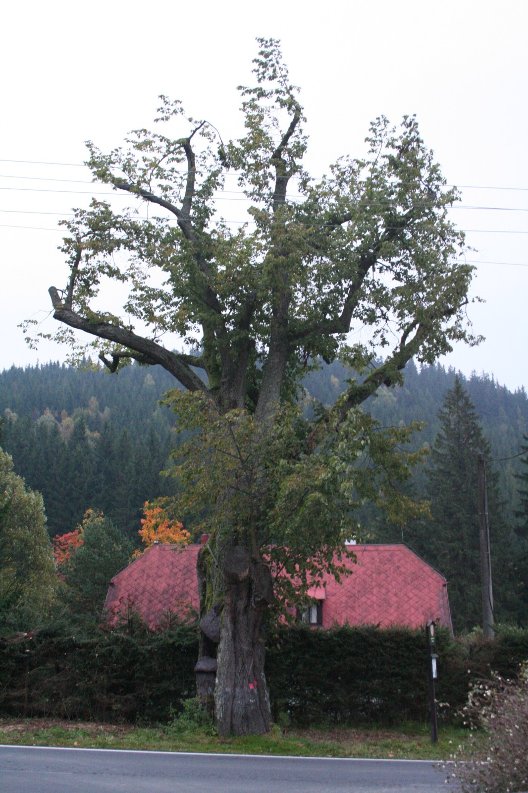 Tato lípa je stará asi 200 let, ale spíš než roky se na ní negativně podepisují nevýhody místa, kde vyrostla. Těsne u krajnice hlavní silnice, navíc na vnitřní straně zatáčky a navíc v blízkosti nadzemního telefonního vedení. Chybí vlastně celá polovina stromu, která zasahovala do silnice a byla tak v kolizi zejména s vyššími nákladními auty. Zbytek koruny je silně prořezaný kvůli odlehčení, aby se kmen nerozlomil. Tomu napomáhá i instalovaná vazba. Obvod jsem v říjnu 2014 naměřil 512 cm.