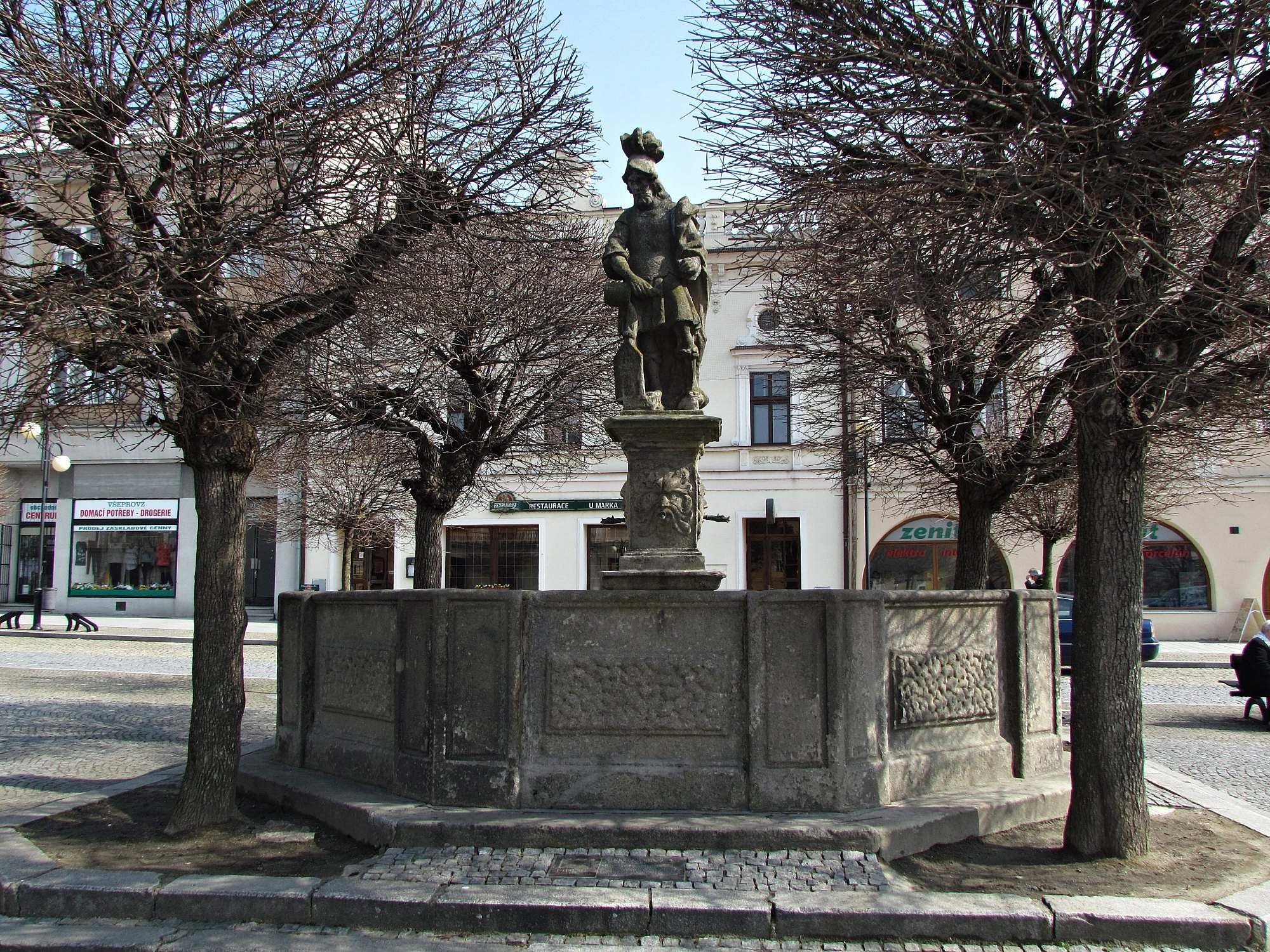 Kašna se sochou sv.Jana Nepomuckého se nachází pod radnicí v jihozápadních prostorách náměstí. Je rovněž osmiboká a na její nádrž byl také použit hrubý pískovec. Tahle je ale mnohem mladší, neboť pochází až z roku 1859. Ze soklu nesoucího postavu světce vyčnívají čtyři vodní chrliče. Podoba našeho nejpopulárnějšího světce je obligátní: oděn je do klasického kanovnického roucha, přes ramena má přehozenu kožešinovou pláštěnku a hlavu zdobí biret. V rukou drží skloněný kříž s Ježíšem Kristem.