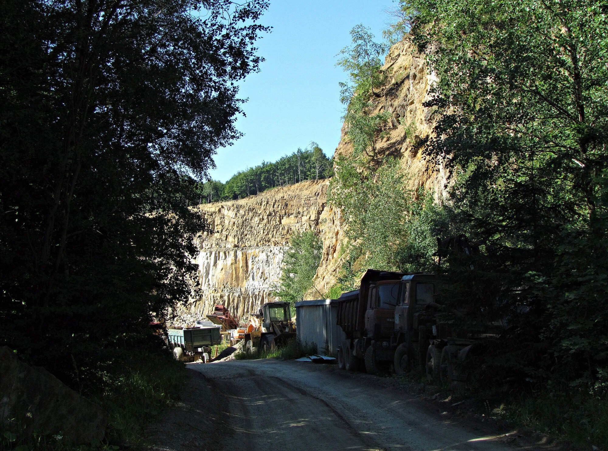 Lom je situován na Bučníku (555 m) pod jeho vrcholem a od hlavní silnice E50 k němu směřuje (0.5 km západně od Motorestu Rasova) zpevněná komunikace lesem, chráněná závorou. Já tu byl o víkendu, kdy se v lomu netěží a cestu jsem využil jako zkratku ke zřícenině Zuvačova, nacházející se o zhruba 1 km dál. Od závory mi to k lomu trvalo asi 15 minut chůze. Patrová těžební jáma je přístupná skalní soutěskou, která byla teď o víkendu proti vstupu zajištěna vysokou a masivní ocelovou konstrukcí. Mezi mřížemi šlo do nitra částečně nahlédnout, ale celkovému pohledu na lom se mi dostalo až na konci výletu v Komni, kde před budovou obecního úřadu stojí Info tabule i s obrázkem těžební jámy z pohledu ptáka.