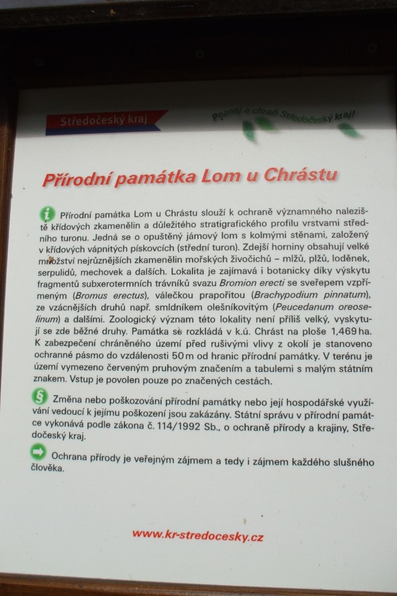 Projdeme vsí Chrást a na jejím konci sejdeme cestou až k podchodu pod železniční tratí.Před ním se dáme doleva podél trati.Dojdeme k informační tabuli na okraji přírodní památky s Osobitým kouzlem. Lom u Chrástu je významné naleziště křídových zkamenělin a důležitý stratigrafický profil, kde jsou zachovány hranice mezi vrstvami středního turonu. Opuštěný jámový lom s kolmými stěnami o výšce 8 m a rozměrech 100 x 40 m byl založen v mořských uloženinách. Je zde zachován jeden z nejúplnějších středoturonských profilů typického jizerského vývoje uloženin české křídy. Místo je zajímavé i pro botaniky.