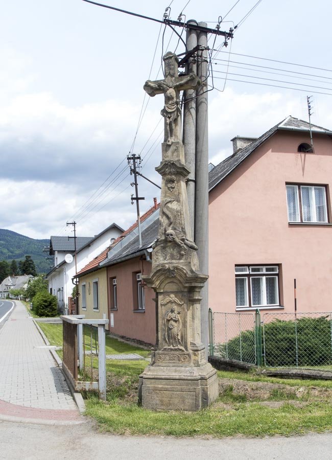 Kříž zhotovil neznámý kameník, podle vzhledu ovšem velmi zkušený. Pískovcový artefakt je umístěn na prolamovaném hranolovém podstavci s dedikačním nápisem. Pokračuje ustupující římsou hranolový dřík sloupu je v čele vyzdoben reliéfem Panny Marie Bolestné (v srdci zabořený meč). V čelním oblouku další římsy je umístěná lastura (to je symbol apoštola Jakuba), Nad lasturou je reliéf Srdce Kristova s paprsky a nápisem HS. V jehlanovitém štíhlém sloupu je reliéf hada (ďábla) a lebky což jsou symboly smrti. Vrchol díla tvoří jetelový kříž s Kristem.