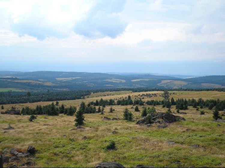 Letní výhled3: Klíny (uprostřed) přes Šumný důl, na obzoru vlevo Klínovec, Jelení hora a Fichtelberg, úplně vpravo Černý vrch