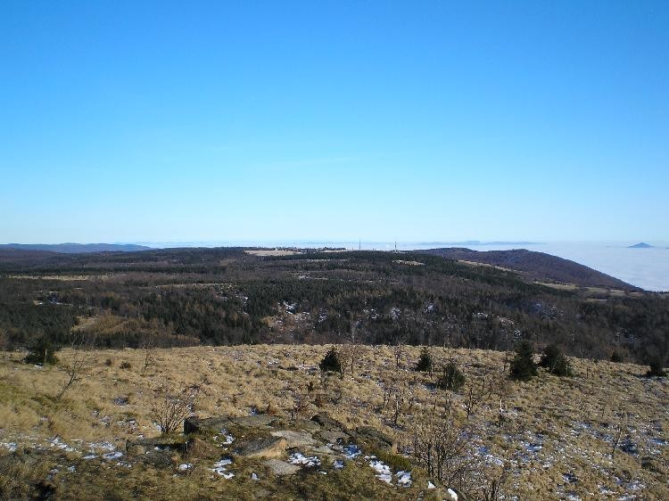 Za podzimní inverze: Pohled přes Lomské údolí do Mostecké pánve (oblačnost v dolech Bílina) a na hřeben kopců Českého středohoří s dominatními Kletečnou, Milešovkou (vlevo), Hradišťany a Ostrým (uprostřed) a na jednotlivé kopce - počínaje Bořní, Kaňk