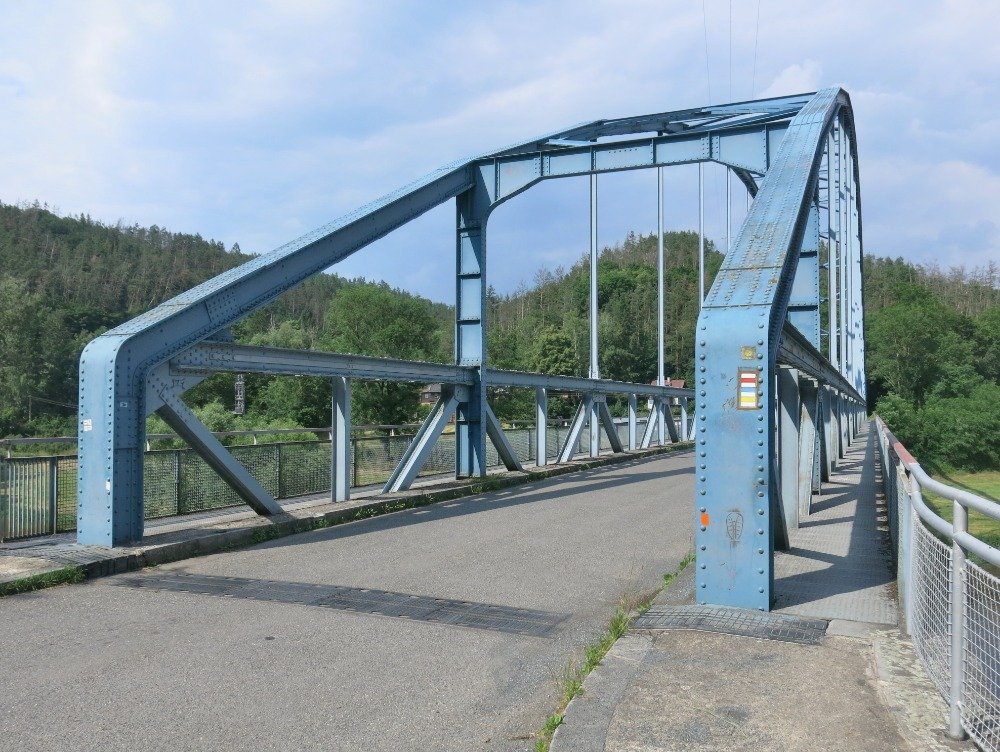 U obce – nebo spíše pod obcí – Skryje na Rakovnicku najdeme zajímavý silniční most přes řeku Berounku. Jedná se o modrý ocelový obloukový most s dolní mostovkou, který byl vyroben v severomoravských vítkovických železárnách v průběhu II. světové války.