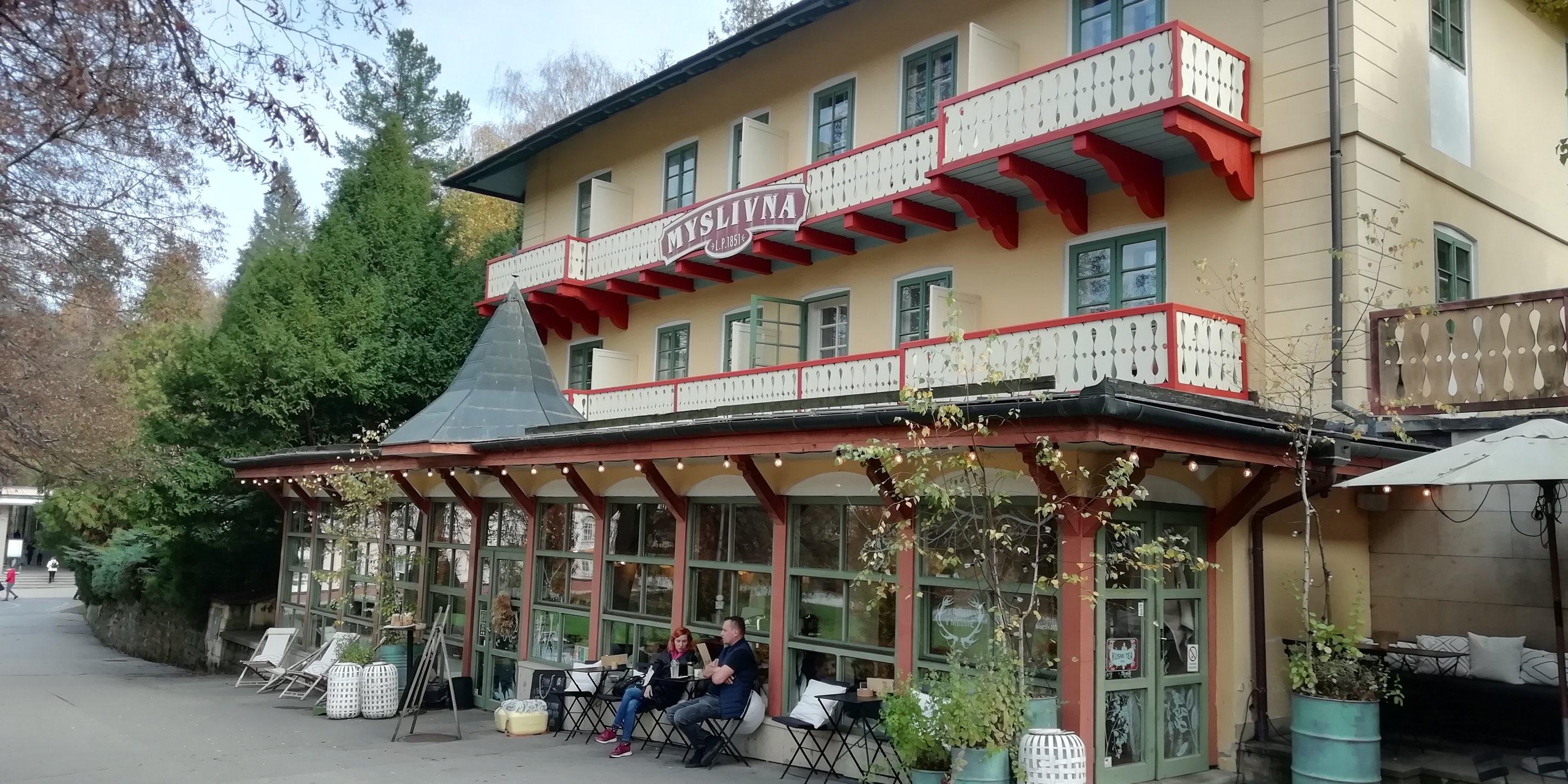 Budova Myslivna bola postavená v roku 1851. Presklená cukráreň a kaviareň boli pristavané neskôr.