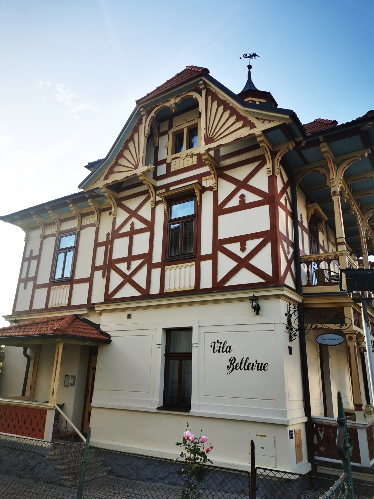 Takou je aj Vila - Penzion Bellevue nádherná budova, ktorú si už na prvý pohľad návštevník spojí so stavebným štýlom dvorného architekta Luhačovic Dušanom Jurkovičom. Budova je z roku 1902, vyznačuje sa unikátnou architektúrou, je vybudovaná v takzvanom švajčiarskom štýle a je pamiatkovo chránená. Vila je samostatnou budovou s murovaným prízemím, nasleduje hrazdené poschodie a obytné podkrovie. Na streche je malá otvorená vežička, stojaca na ôsmych stĺpikoch s osemhrannou strechou.